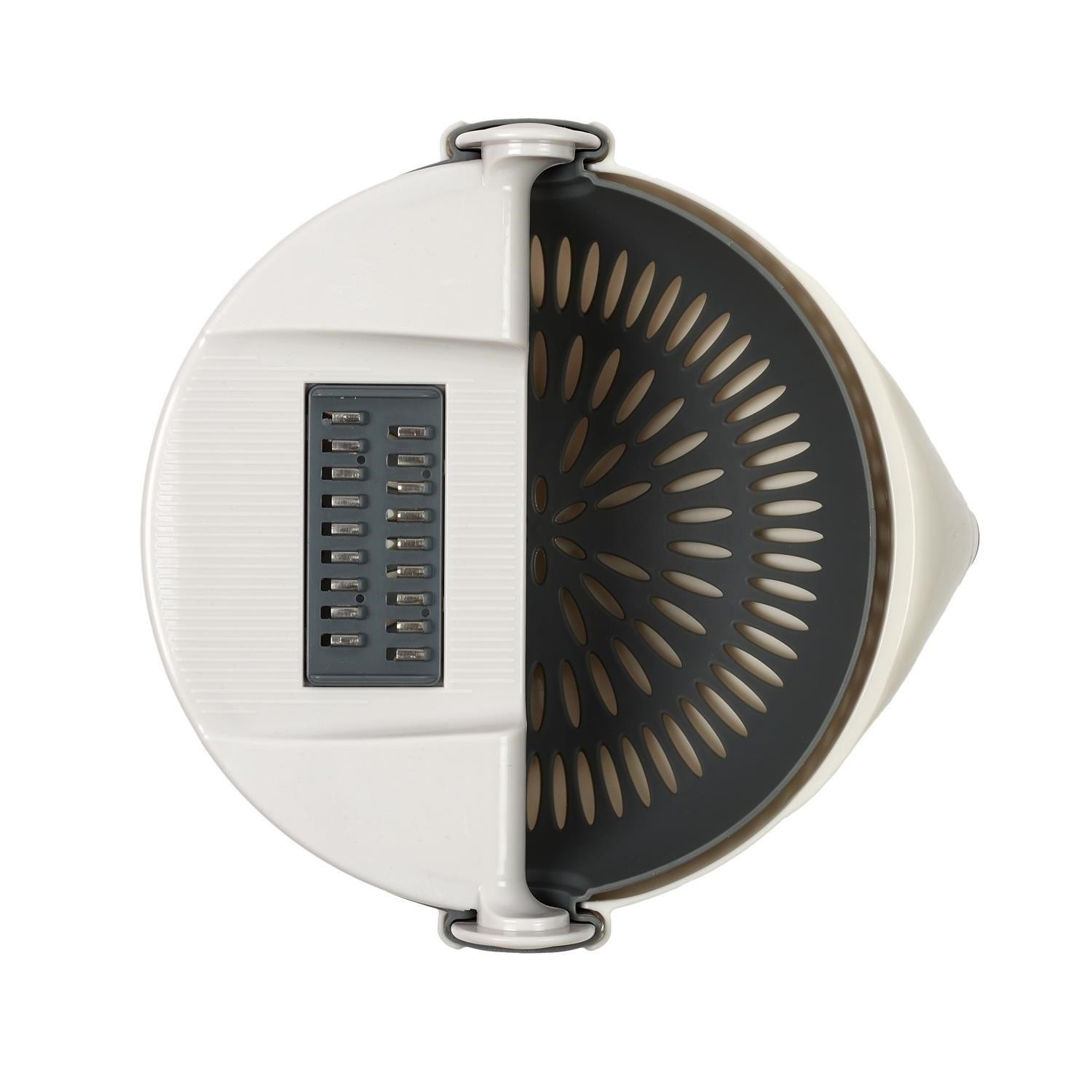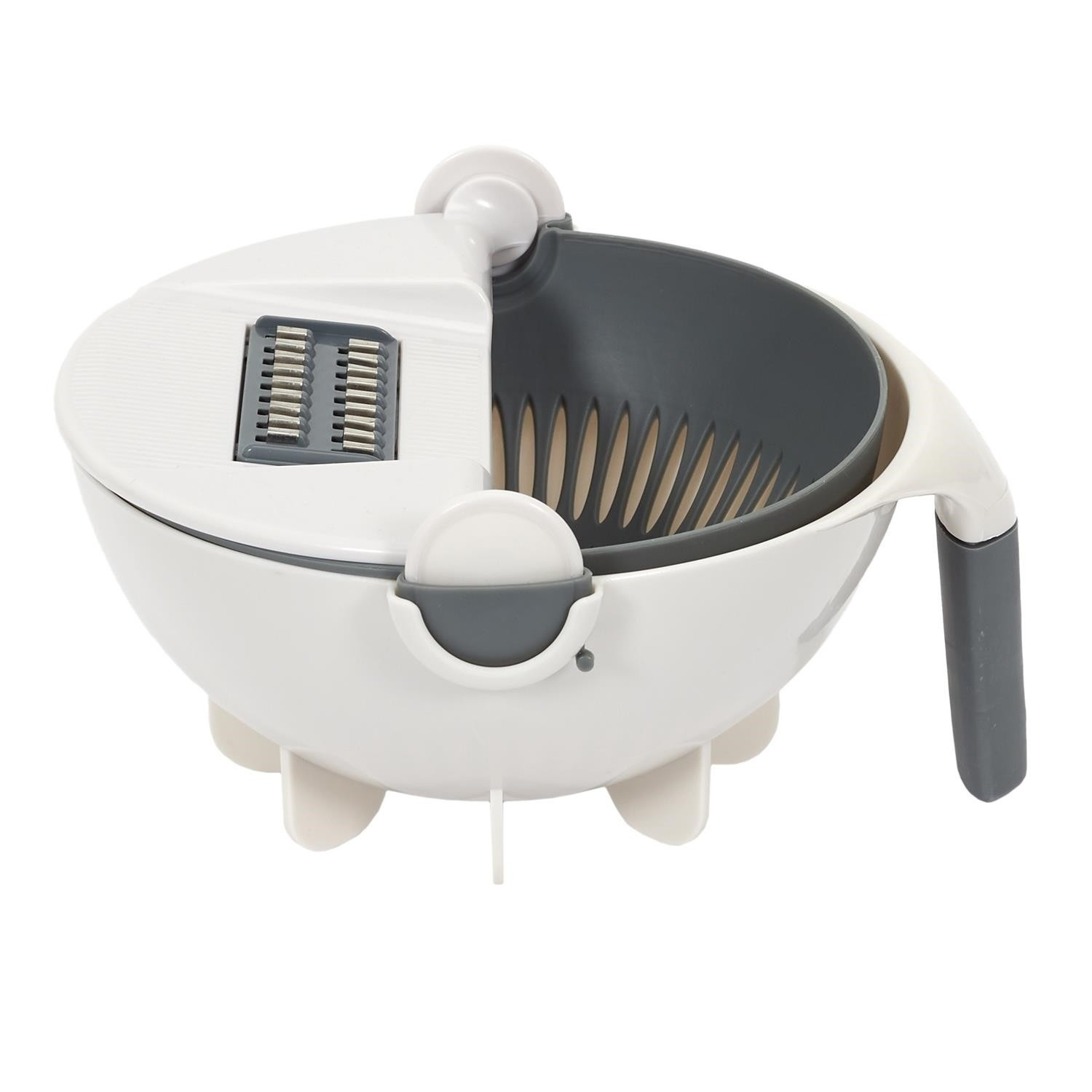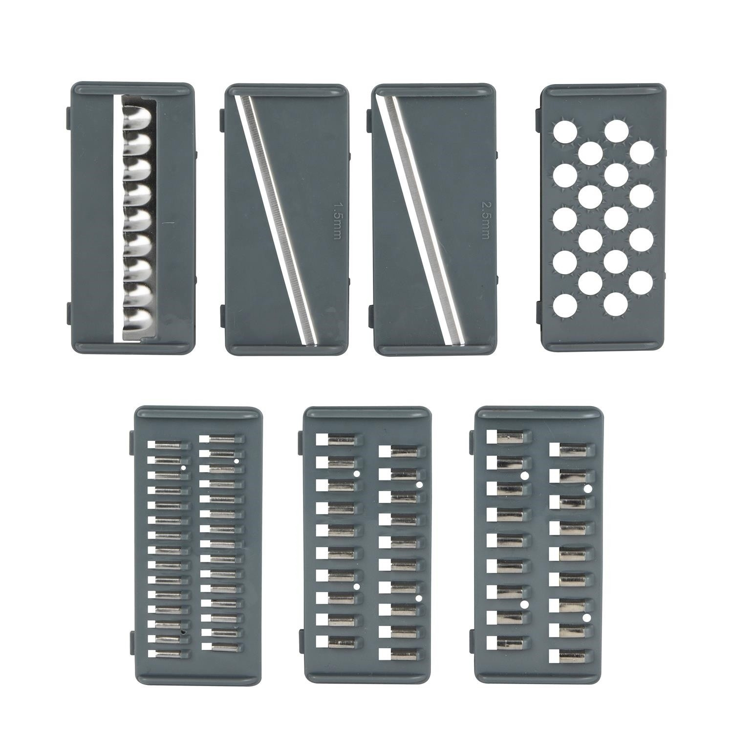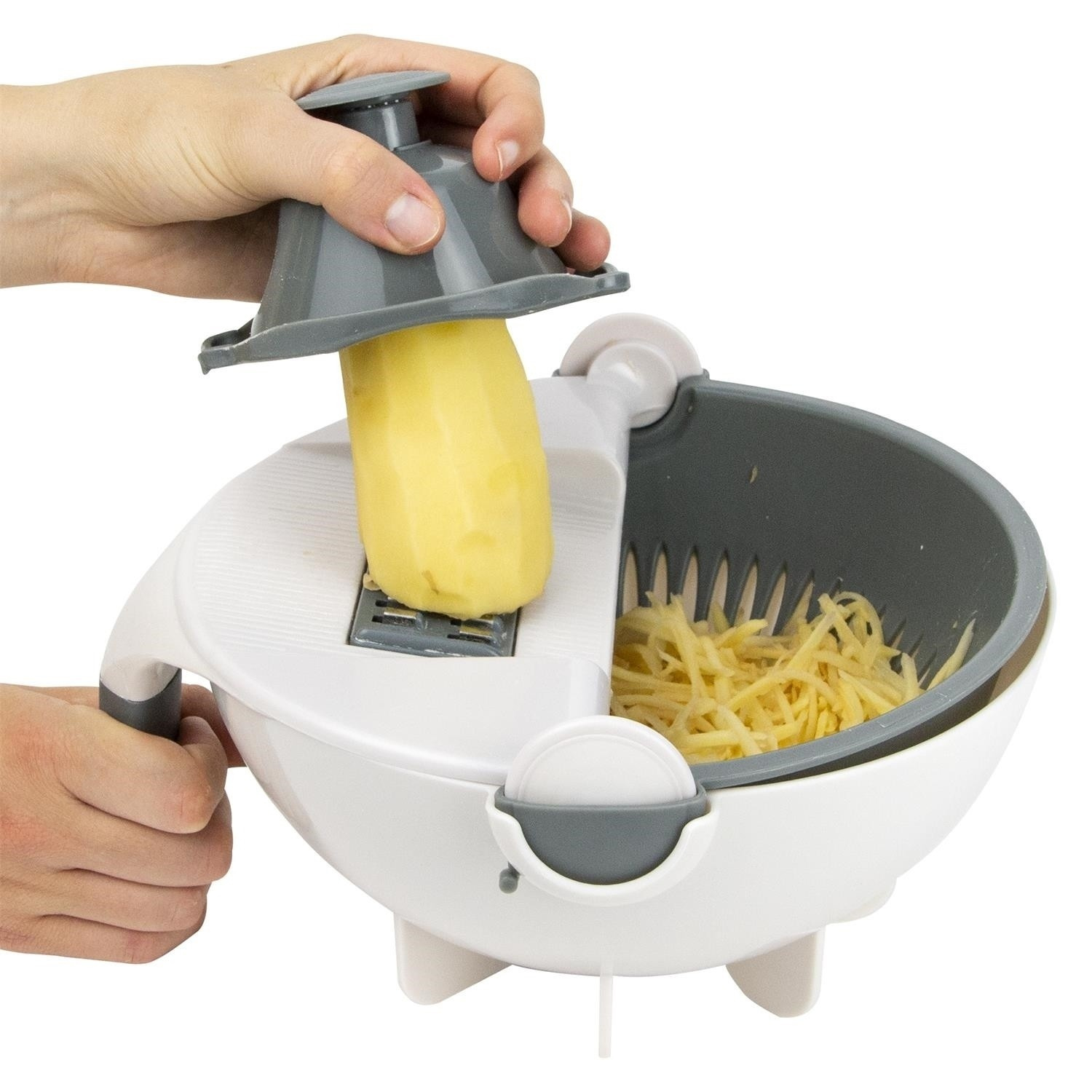 Neztrácej čas a místo díky této multifunkční struhadlu na zeleninu. Obsahuje: 1 bezpečnostní tlačítko. 1 snímatelný kryt řezacího zařízení. 1 vyjímatelné otočné sítko. 7 různých a vyměnitelných čepelí. 1 miska o objemu 1,5 l s protiskluzovým úchytem - Složení: Plast. Plast Ideální struhadlo na strouhání a odkapávání brambor na placky nebo okurek na salát.