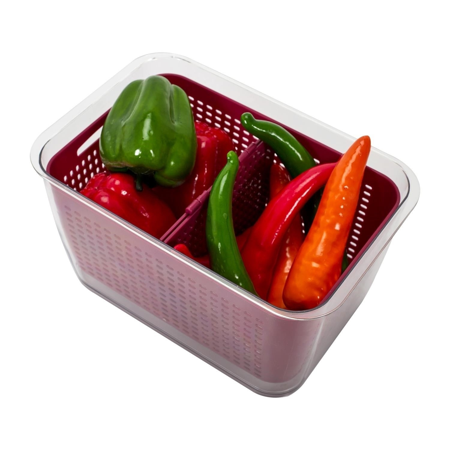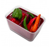 Nádoba na skladování ovoce a zeleniny v lednici umožní udržet naše potraviny čerstvé. Kontejner byl vybaven mřížkovým košem s možností jeho rozdělení na dva. Koš umístěný dodatečně v transparentním kontejneru s víkem umožňuje udržet čerstvost a pachy z lednice se nedostanou k zabezpečeným produktům. Kontejner vyrobený z polypropylenu