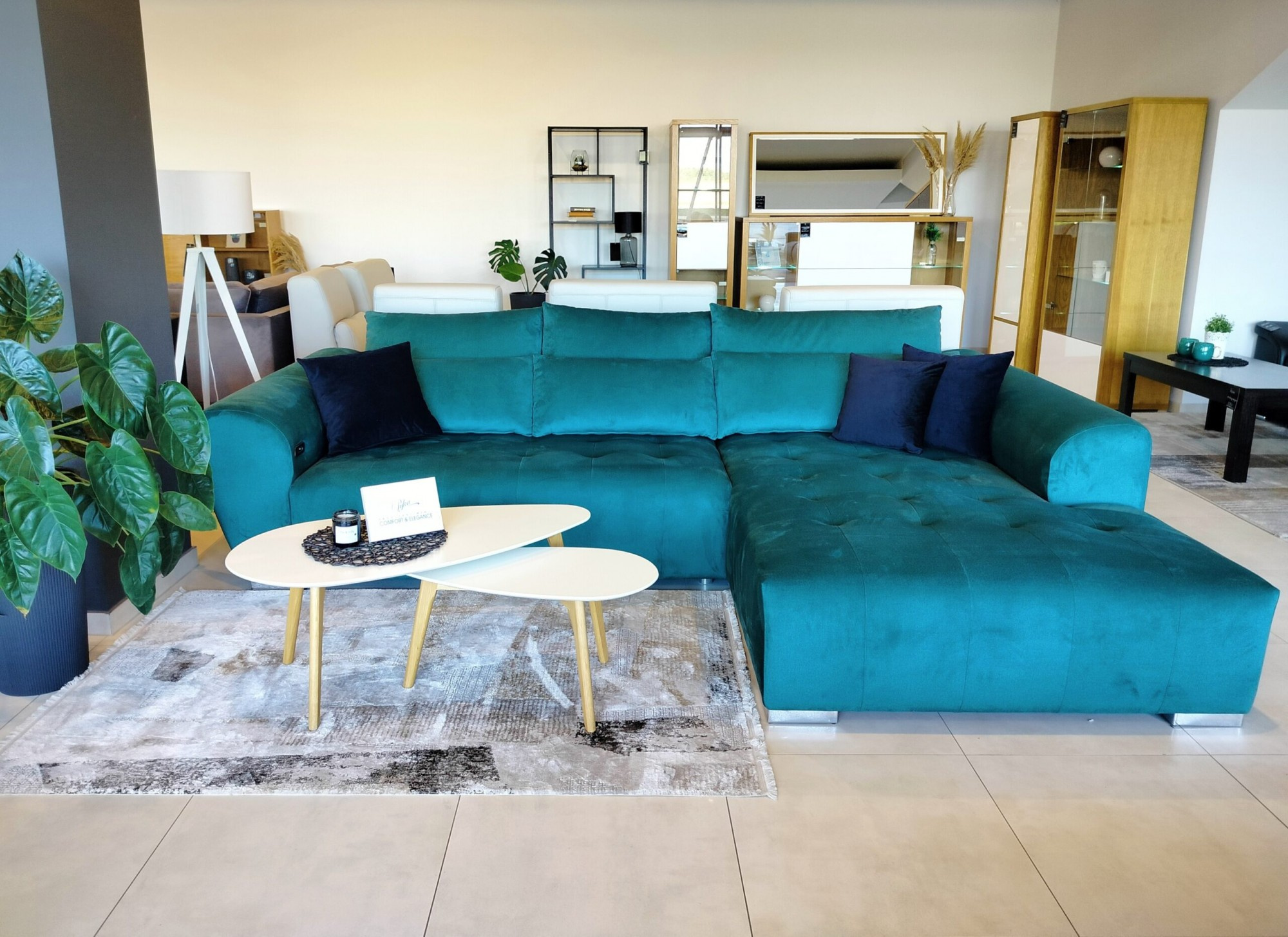 Rohová pohovka Venecja s elektrickou funkcí spaní je moderní kus nábytku, který se skvěle hodí do velkého obývacího pokoje. Dalším prvkem je dekorativní prošívání na sedáku.