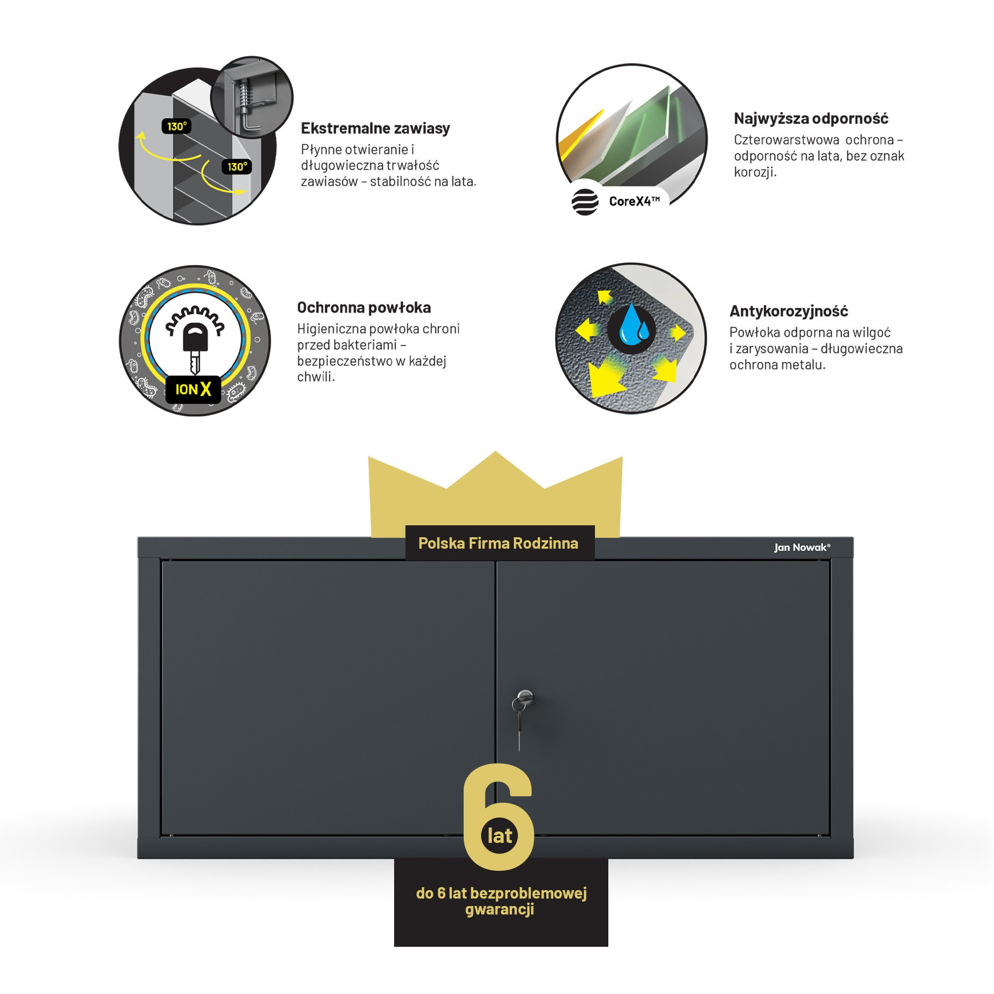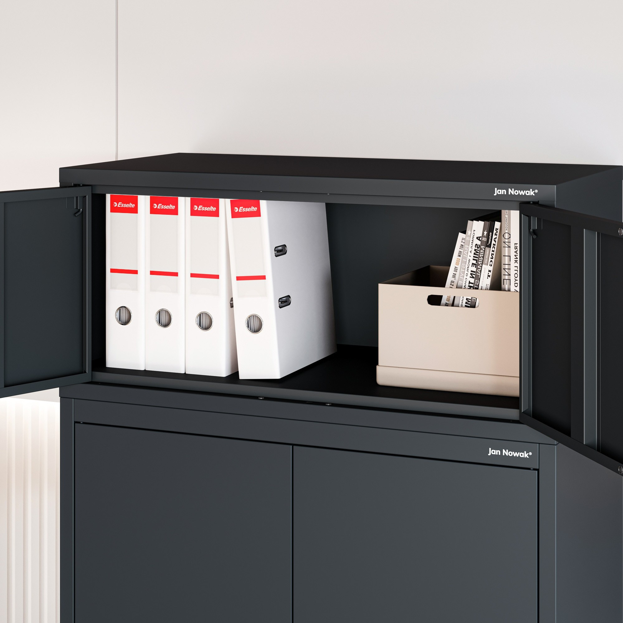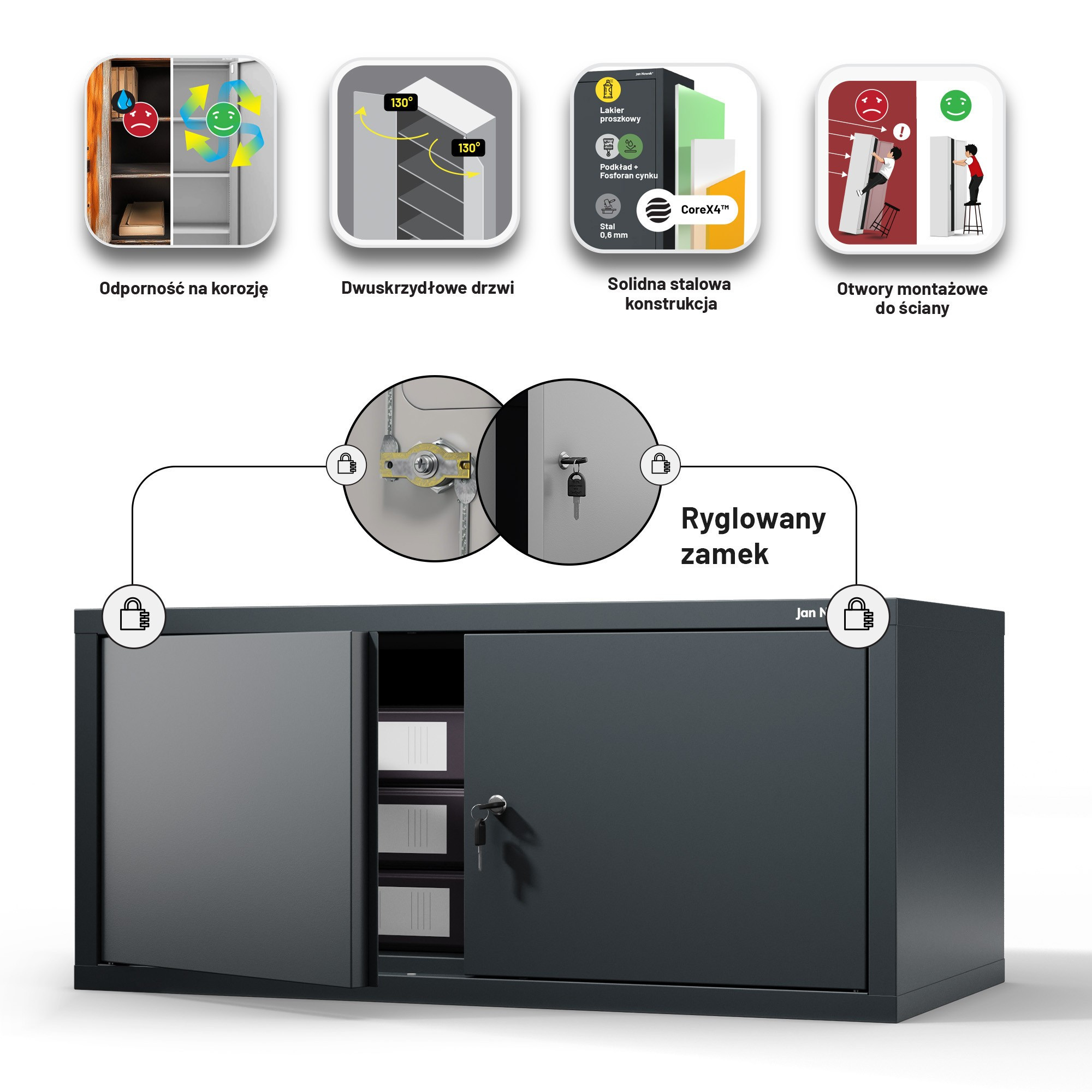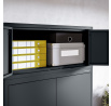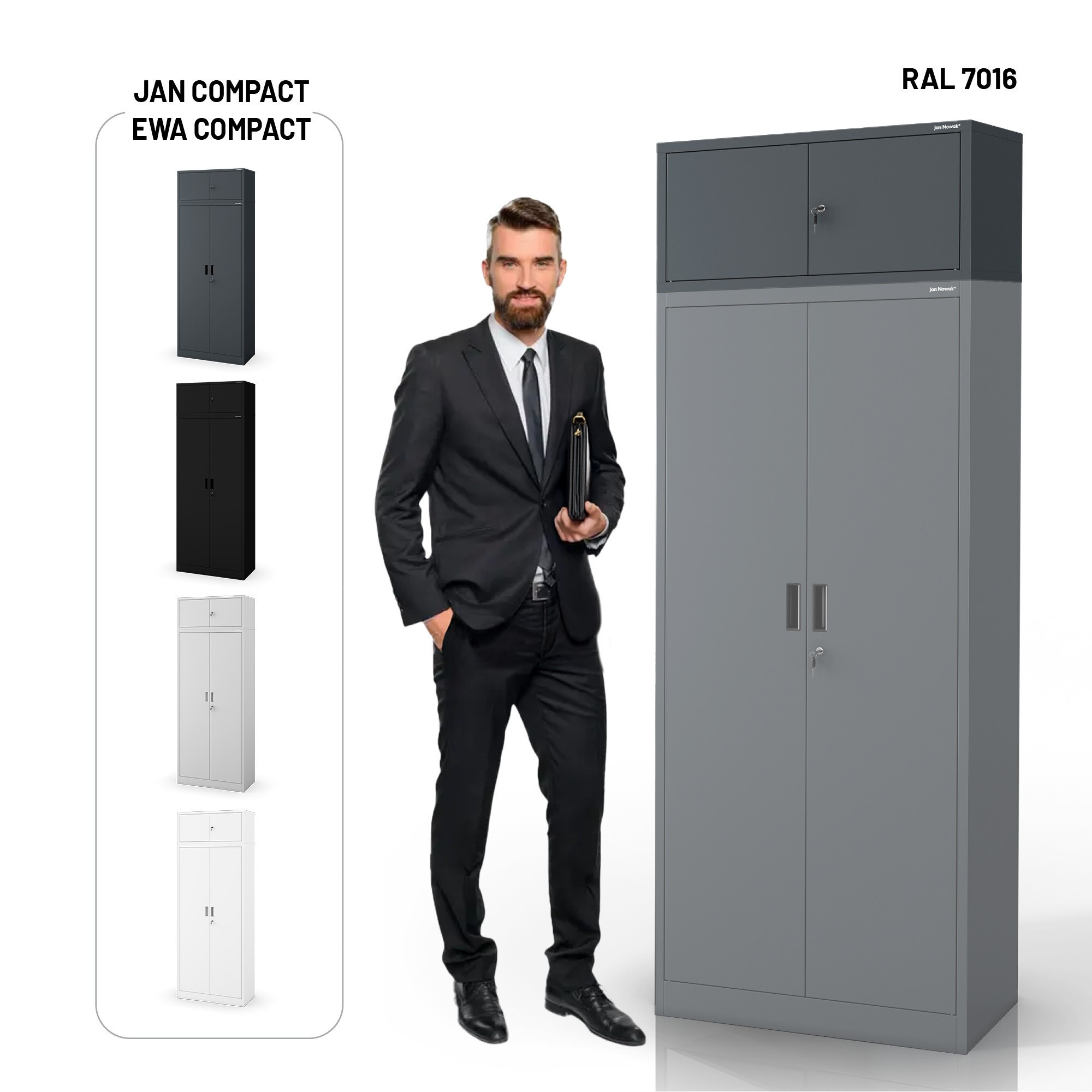 EWA Compact je navržen s důrazem na detail. CNC ohýbání zajišťuje precizní tvarování hran bez nevzhledných svarů. Skrytý montážní systém "drop on" s čepy zaručuje stabilní a bezpečné spojení se skříní JAN Compact a zároveň neruší celkový vzhled. Antracitová barva je univerzální a snadno se kombinuje s různými styly interiéru. EWA Compact tak nejenže splní svůj praktický účel, ale také se stane elegantním doplňkem vašeho prostoru.