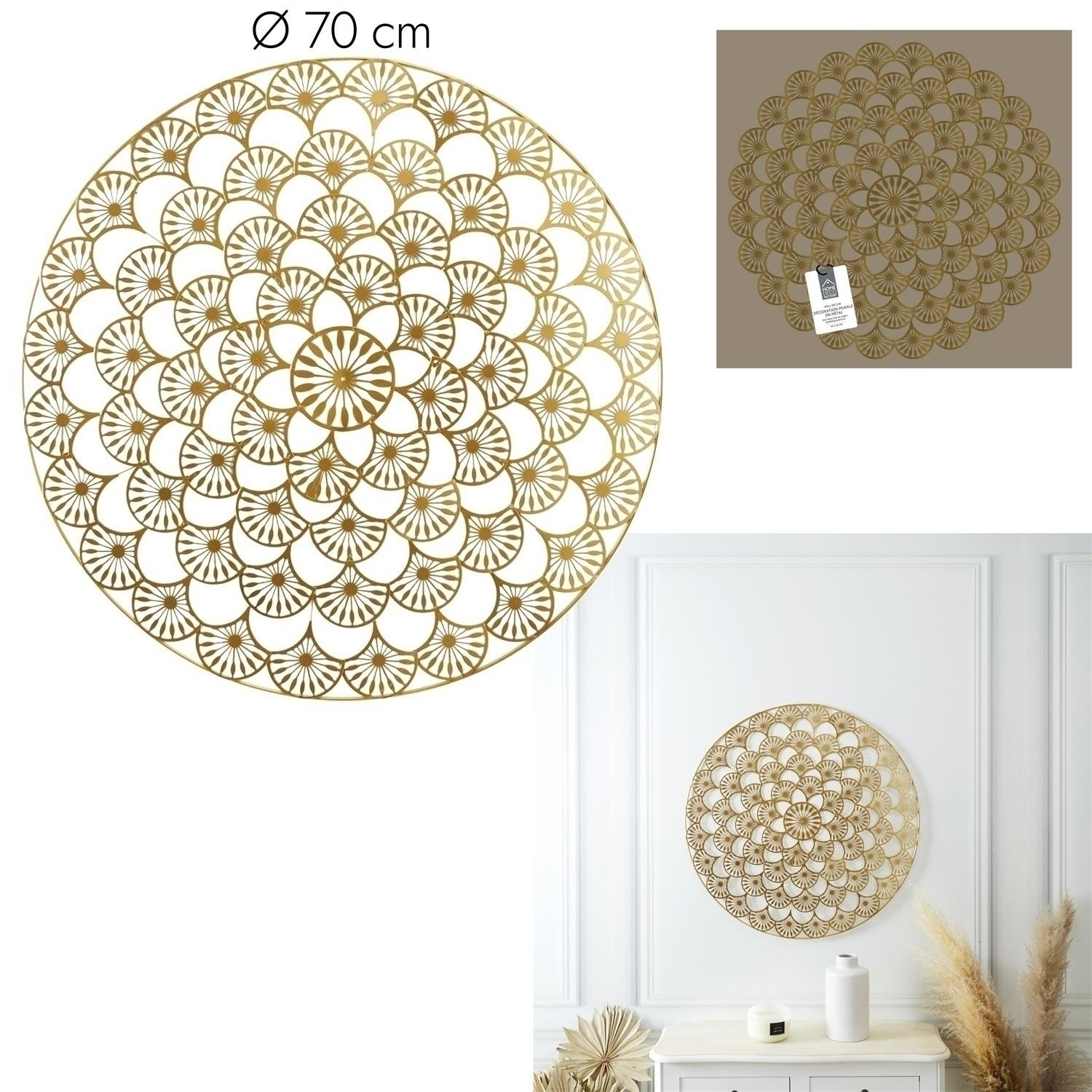 Kovová nástěnná dekorace ve tvaru mandaly dodá interiéru harmonii a bude jeho jedinečnou ozdobou. Kulatá, zlatá ozdoba o průměru 70 cm se vyznačuje jemným, opakujícím se vzorem, který díky své prolamované konstrukci nepůsobí těžkopádně. Lehká ozdoba způsobí, že obyčejná prázdná stěna získá charakter. Hmotnost: 1,25 kg Rozměry balení: 15,5x72,5x73 cm, Max 8 ks v kartonu