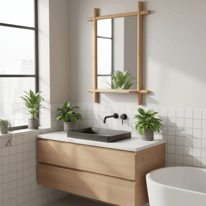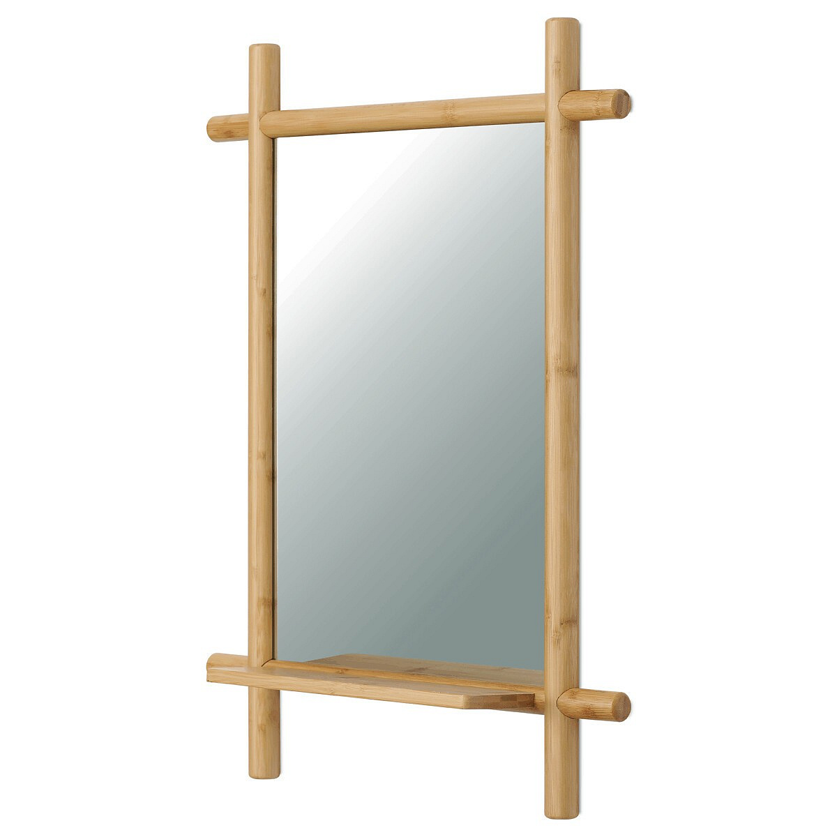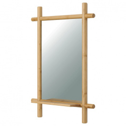 Nástěnné zrcadlo o rozměrech 55x74 cm je vyrobeno z masivního bambusu v přírodním odstínu, který dodává prostoru příjemnou a teplou atmosféru. Zrcadlová plocha je z kvalitního skla s čistým odrazem, ideální pro každodenní použití. Součástí je praktická police z bambusu, vhodná pro odkládání drobných předmětů, která zvyšuje funkčnost zrcadla. Design s viditelnými kulatými bambusovými prvky působí přirozeně a zároveň moderně, což umožňuje snadné začlenění do různých interiérů. Zrcadlo se upevňuje na stěnu, čímž šetří místo a zároveň plní dekorativní i praktickou funkci.