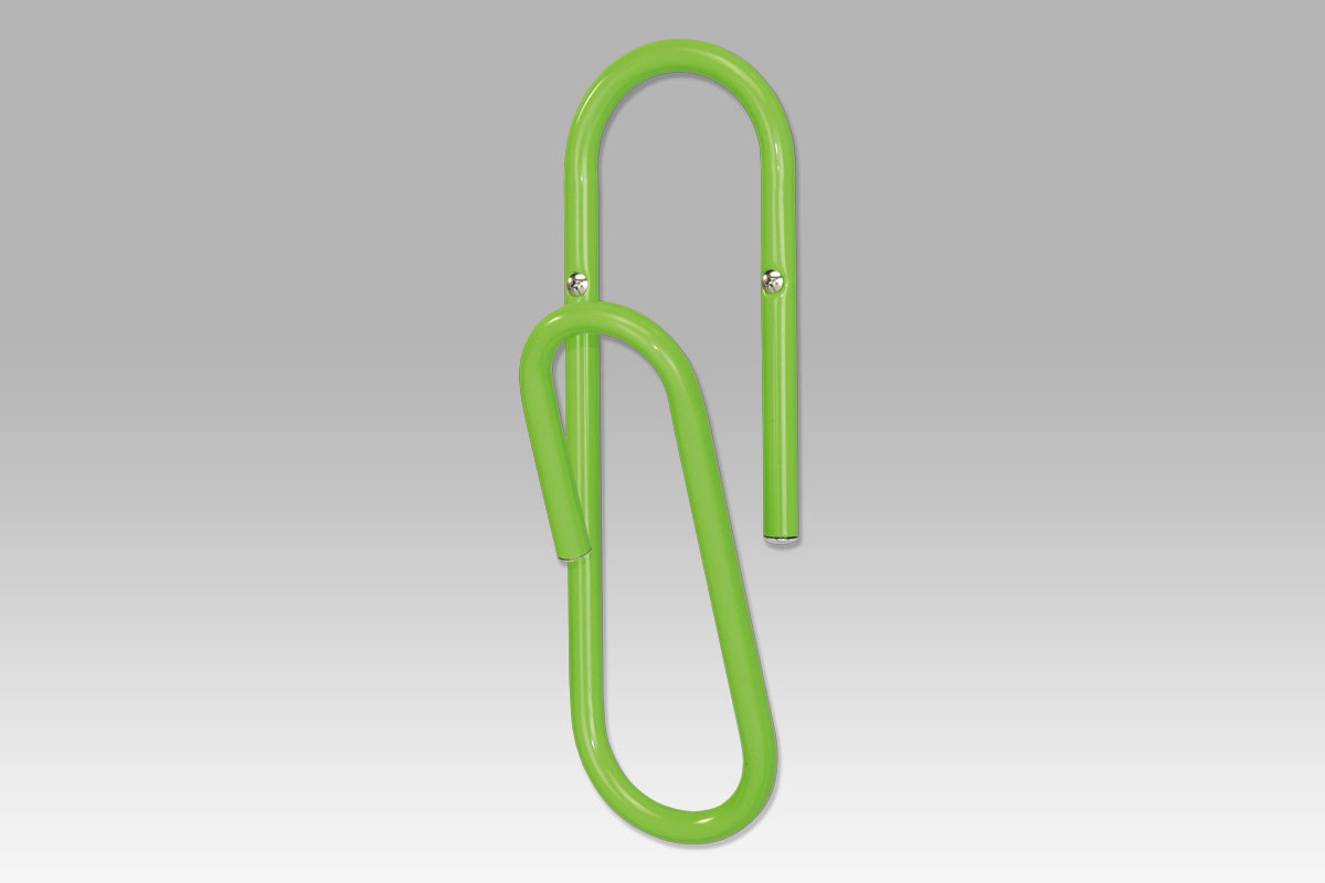 Nástěnný věšák "kancelářská spona" v limetkově zelené barvě.