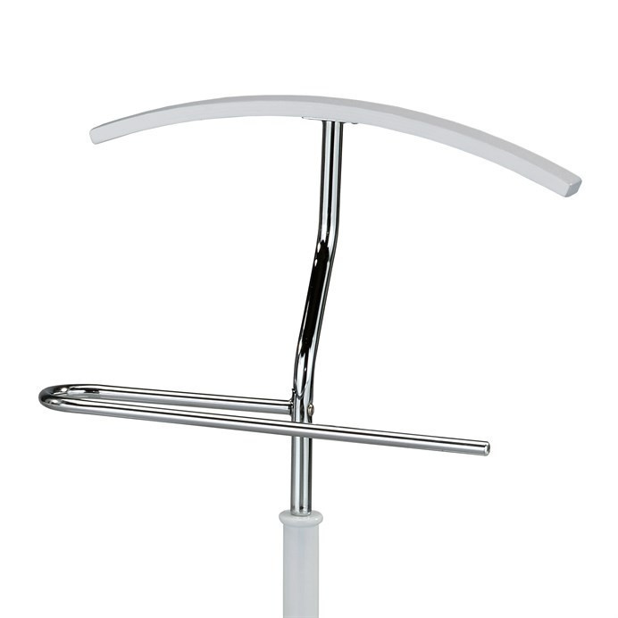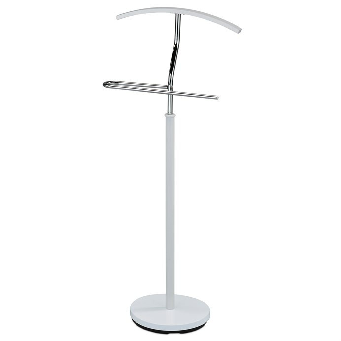Němý sluha v kombinaci chromu a bílé barvy nabízí praktické řešení pro uložení oděvů a doplňků v ložnici či předsíni. Masivní základna zajišťuje stabilitu, zatímco chromované prvky dodávají moderní vzhled a odolnost proti opotřebení. Obloukový věšák je vhodný pro zavěšení košil, sak či kalhot, přičemž horizontální tyč umožňuje pohodlné zavěšení kalhot nebo šál. Kompaktní rozměry usnadňují umístění i do menších prostor. Design kombinuje funkčnost s jednoduchostí, což ocení každý, kdo hledá praktický a nenáročný doplněk interiéru.