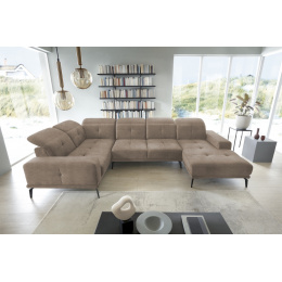 Rohová pohovka Neviro je moderní kus nábytku s důmyslnými prvky, které výrazně usnadňují relaxaci. Zajímavým řešením, kterým je Neviro vybaven, je funkce posuvných opěradel - která vám umožňuje pohodlně si nastavit polohu těla. Chytré, nastavitelné opěrky hlavy a pohodlná opěrka rukou zvyšují komfort. Sedák nábytku je vyroben z vysoce pružné HR pěny a vlnité pružiny, což ještě více zvyšuje pocit pohodlí. Kromě toho Neviro nabízí estetický zážitek díky stylovému prošívání a elegantnímu šití. Dalším charakteristickým rysem rohové pohovky jsou vysoké černé ocelové nohy. Neviro je kus nábytku s rozměry: 350 x 201 x 77 cm.