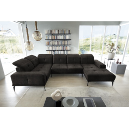 Rohová pohovka Neviro je moderní kus nábytku s důmyslnými prvky, které výrazně usnadňují relaxaci. Zajímavým řešením, kterým je Neviro vybaven, je funkce posuvných opěradel - která vám umožňuje pohodlně si nastavit polohu těla. Chytré, nastavitelné opěrky hlavy a pohodlná opěrka rukou zvyšují komfort. Sedák nábytku je vyroben z vysoce pružné HR pěny a vlnité pružiny, což ještě více zvyšuje pocit pohodlí. Kromě toho Neviro nabízí estetický zážitek díky stylovému prošívání a elegantnímu šití. Dalším charakteristickým rysem rohové pohovky jsou vysoké černé ocelové nohy. Neviro je kus nábytku s rozměry: 350 x 201 x 77 cm.