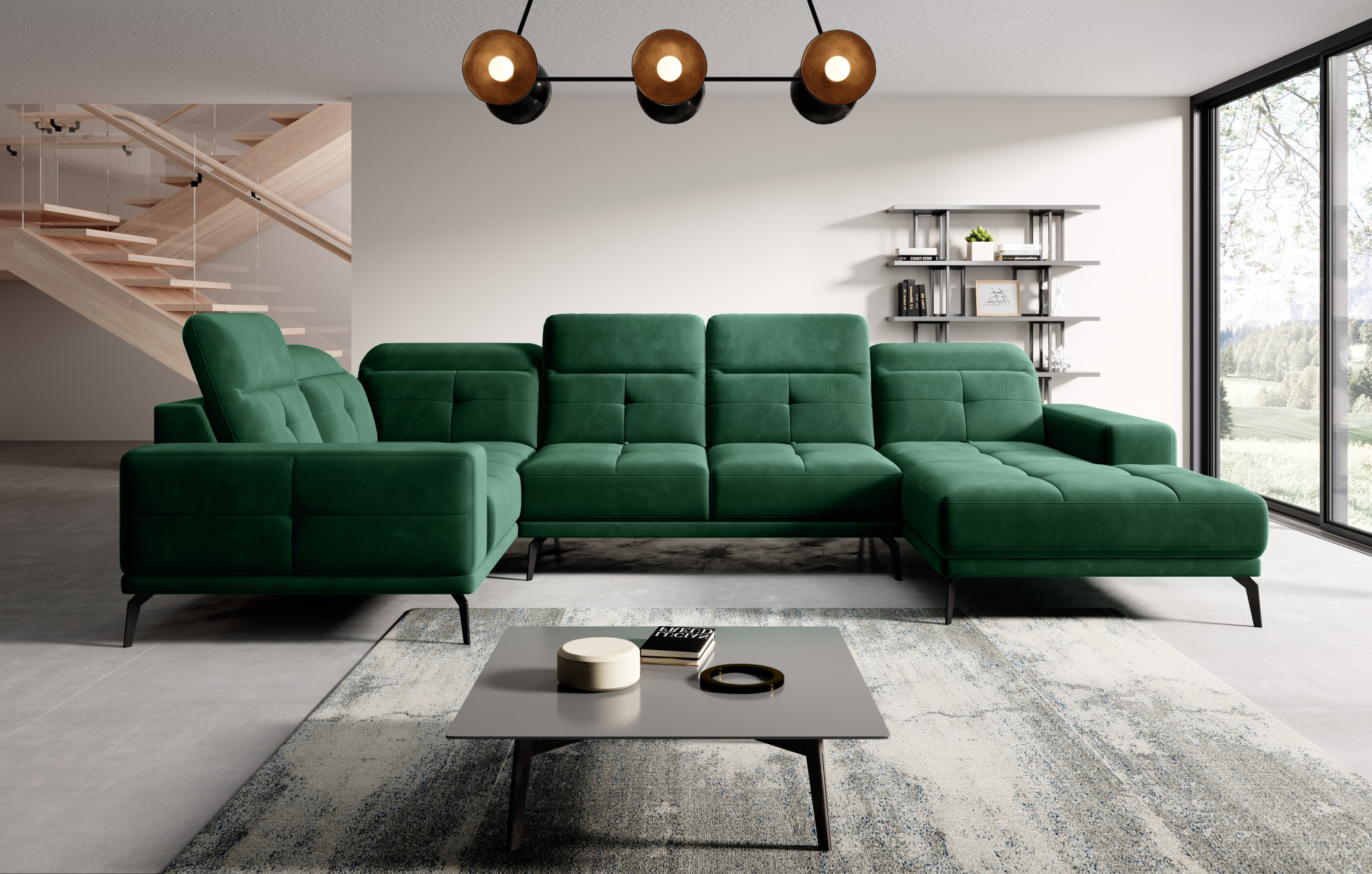 Rohová pohovka Neviro je moderní kus nábytku s důmyslnými prvky, které výrazně usnadňují relaxaci. Zajímavým řešením, kterým je Neviro vybaven, je funkce posuvných opěradel - která vám umožňuje pohodlně si nastavit polohu těla. Chytré, nastavitelné opěrky hlavy a pohodlná opěrka rukou zvyšují komfort. Sedák nábytku je vyroben z vysoce pružné HR pěny a vlnité pružiny, což ještě více zvyšuje pocit pohodlí. Kromě toho Neviro nabízí estetický zážitek díky stylovému prošívání a elegantnímu šití. Dalším charakteristickým rysem rohové pohovky jsou vysoké černé ocelové nohy. Neviro je kus nábytku s rozměry: 350 x 201 x 77 cm.