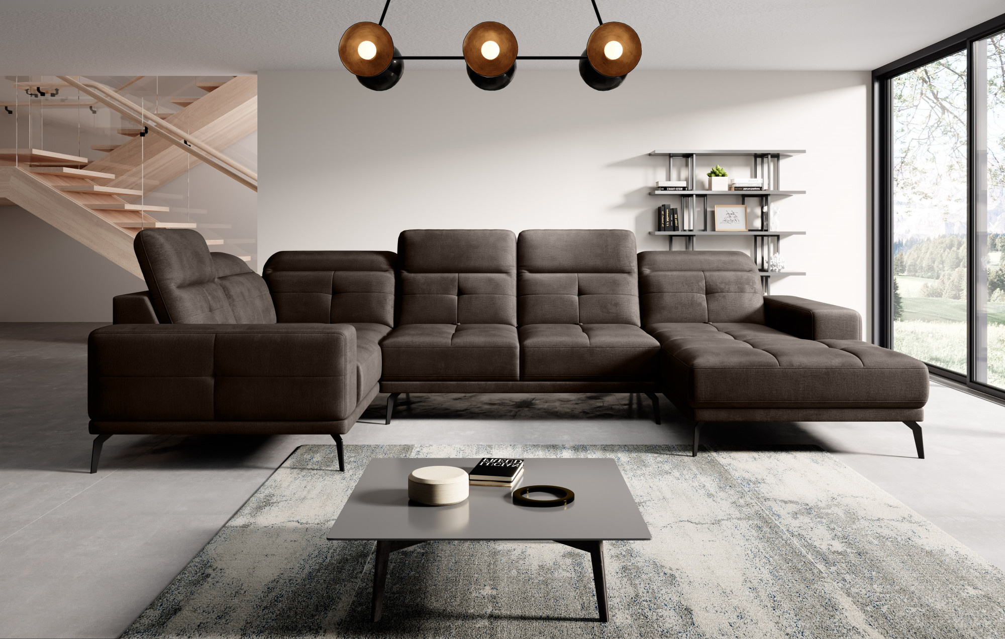 Rohová pohovka Neviro je moderní kus nábytku s důmyslnými prvky, které výrazně usnadňují relaxaci. Zajímavým řešením, kterým je Neviro vybaven, je funkce posuvných opěradel - která vám umožňuje pohodlně si nastavit polohu těla. Chytré, nastavitelné opěrky hlavy a pohodlná opěrka rukou zvyšují komfort. Sedák nábytku je vyroben z vysoce pružné HR pěny a vlnité pružiny, což ještě více zvyšuje pocit pohodlí. Kromě toho Neviro nabízí estetický zážitek díky stylovému prošívání a elegantnímu šití. Dalším charakteristickým rysem rohové pohovky jsou vysoké černé ocelové nohy. Neviro je kus nábytku s rozměry: 350 x 201 x 77 cm.
