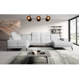 Rohová pohovka Neviro je moderní kus nábytku s důmyslnými prvky, které výrazně usnadňují relaxaci. Zajímavým řešením, kterým je Neviro vybaven, je funkce posuvných opěradel - která vám umožňuje pohodlně si nastavit polohu těla. Chytré, nastavitelné opěrky hlavy a pohodlná opěrka rukou zvyšují komfort. Sedák nábytku je vyroben z vysoce pružné HR pěny a vlnité pružiny, což ještě více zvyšuje pocit pohodlí. Kromě toho Neviro nabízí estetický zážitek díky stylovému prošívání a elegantnímu šití. Dalším charakteristickým rysem rohové pohovky jsou vysoké černé ocelové nohy. Neviro je kus nábytku s rozměry: 350 x 201 x 77 cm.