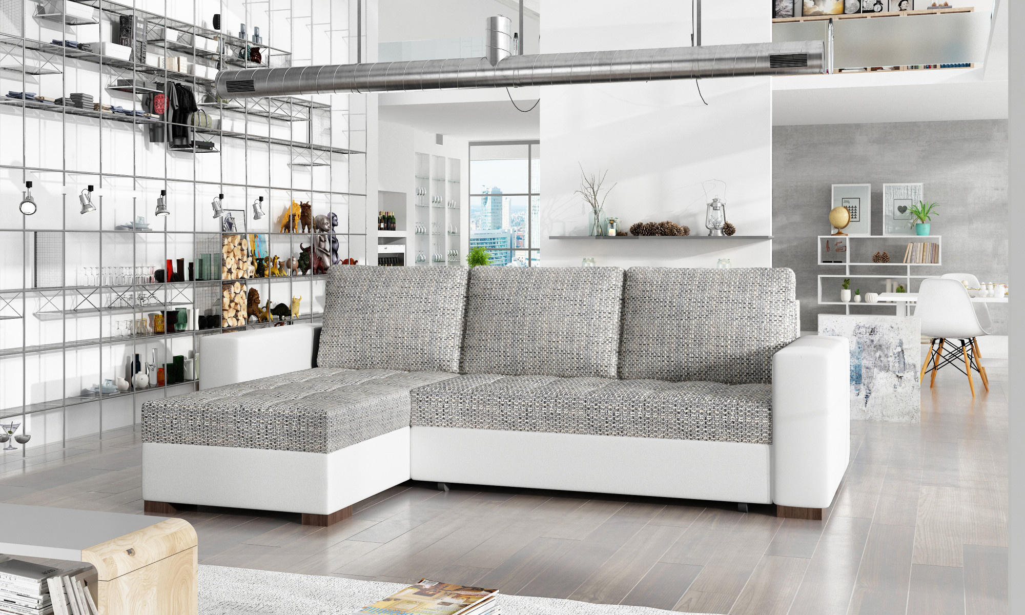 Newark je elegantní, klasická a minimalistická rohová pohovka s rozměry 237 x 150 x 90 cm, která se dokonale hodí do jakéhokoli interiéru bez ohledu na jeho velikost. Sedák našeho nábytku je vyplněn bonell pružinami a pěnou T25, což zajišťuje maximální pohodlí při každodenním používání. Další výhodou nábytku je jeho přizpůsobení pro funkci spaní a dva úložné prostory na ložní prádlo. Po rozložení nábytku pomocí DL automatu získáme postel s rozměry 195 x 125 cm. Mezi jeho charakteristické rysy můžeme zahrnout: čalouněné opěradlo, prostorné polštáře a prošívání na sedácích.