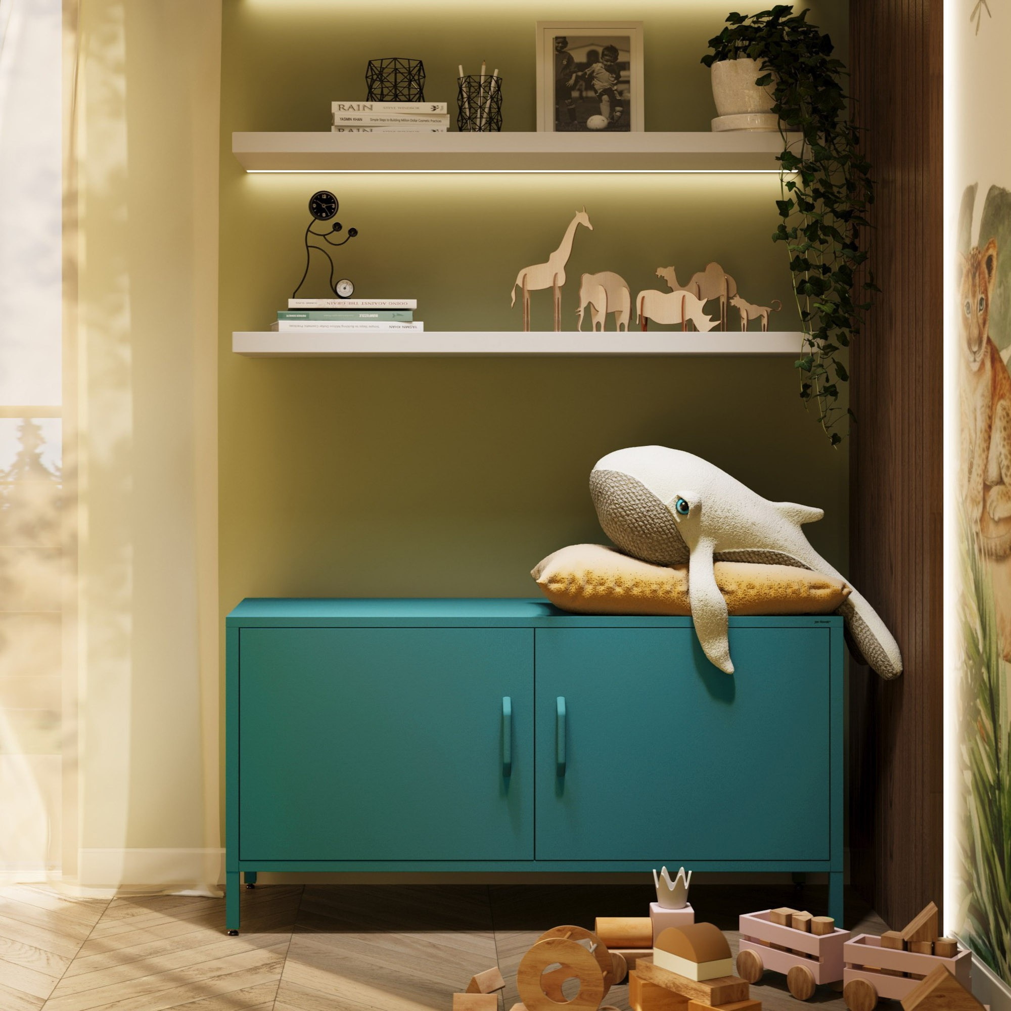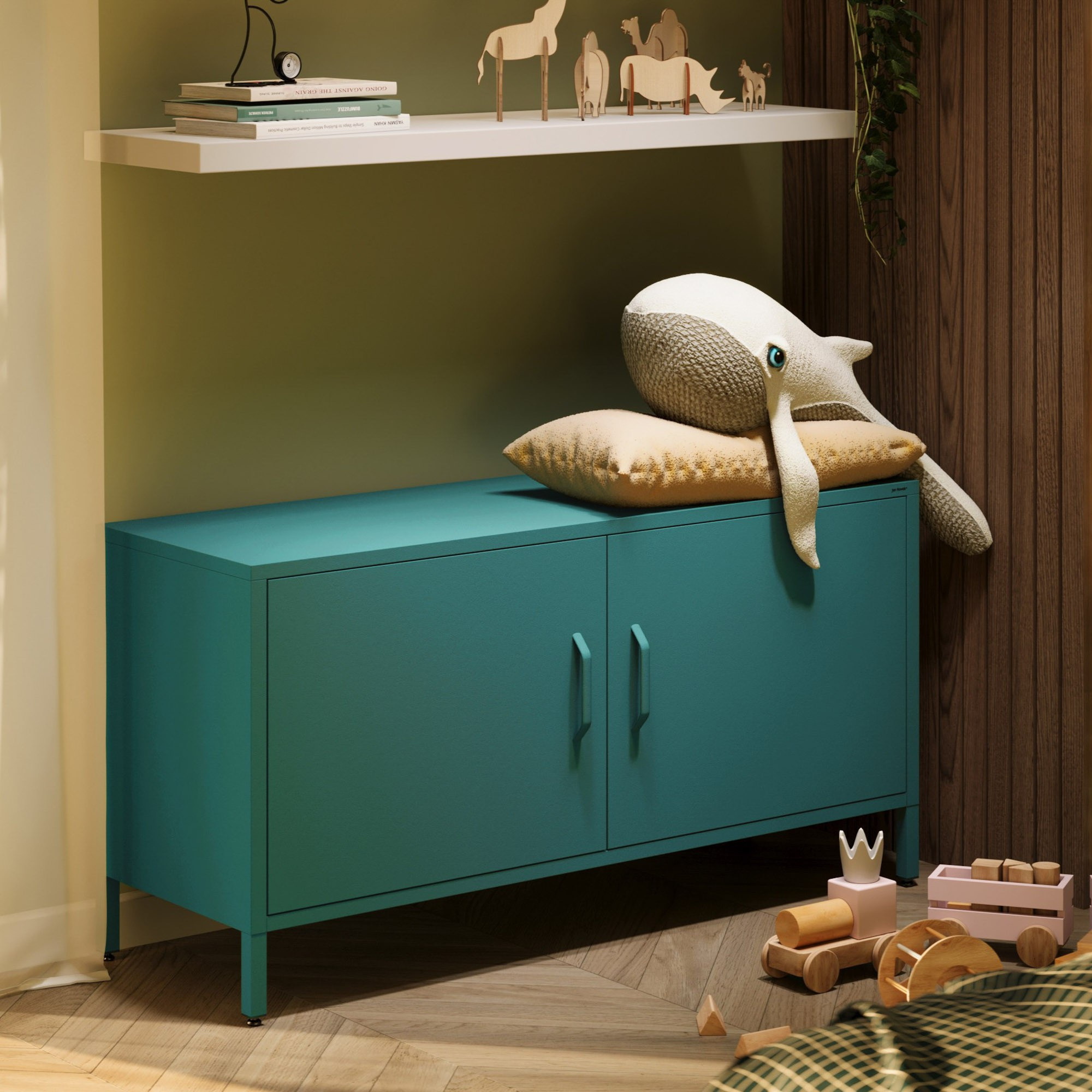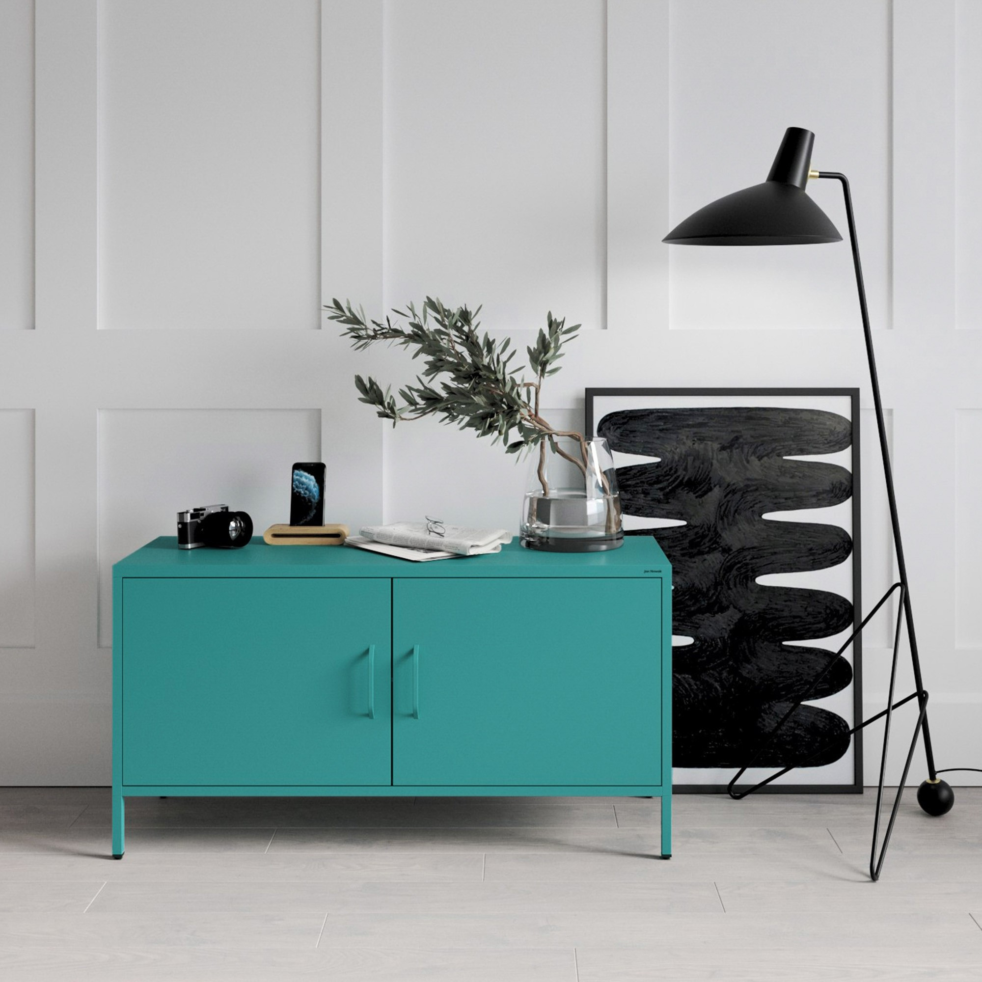 Nízká kovová skříňka na nožkách mořská Moderní ROSA, 1150 x 595 x 400 mm