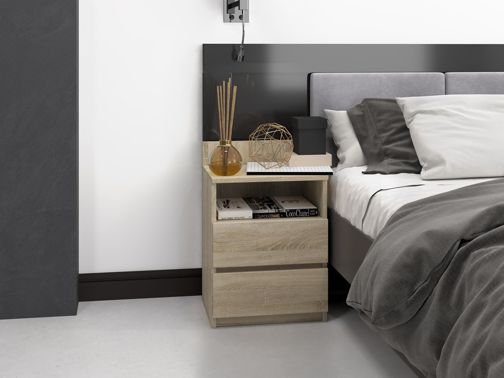 Nepostradatelným prvkem každé ložnice jsou noční stolky. Nadčasový stolek Malvína v minimalistickém designu splní očekávání všech, kteří oceňují kombinaci jednoduchosti a elegance. Bezúchytková čela zásuvek zajistí pohodlné používání a dokreslí moderní a útulný charakter vašeho interiéru. Je vyroben ze snadno udržovatelného lamina, hrany jsou zakončené vysoce odolným ABS materiálem.