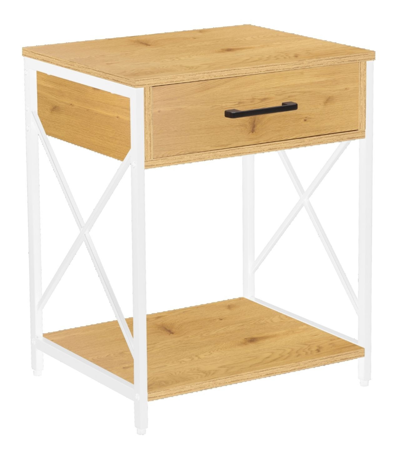 ROZMĚRY: - hloubka: 40 cm - šířka: 48 cm - výška: 60 cm MATERIÁL: - deska: laminovaná deska - rám: kov lakovaný práškovou barvou BARVA: - deska: přírodní dub - rám: bílý OSTATNÍ: - zásuvka