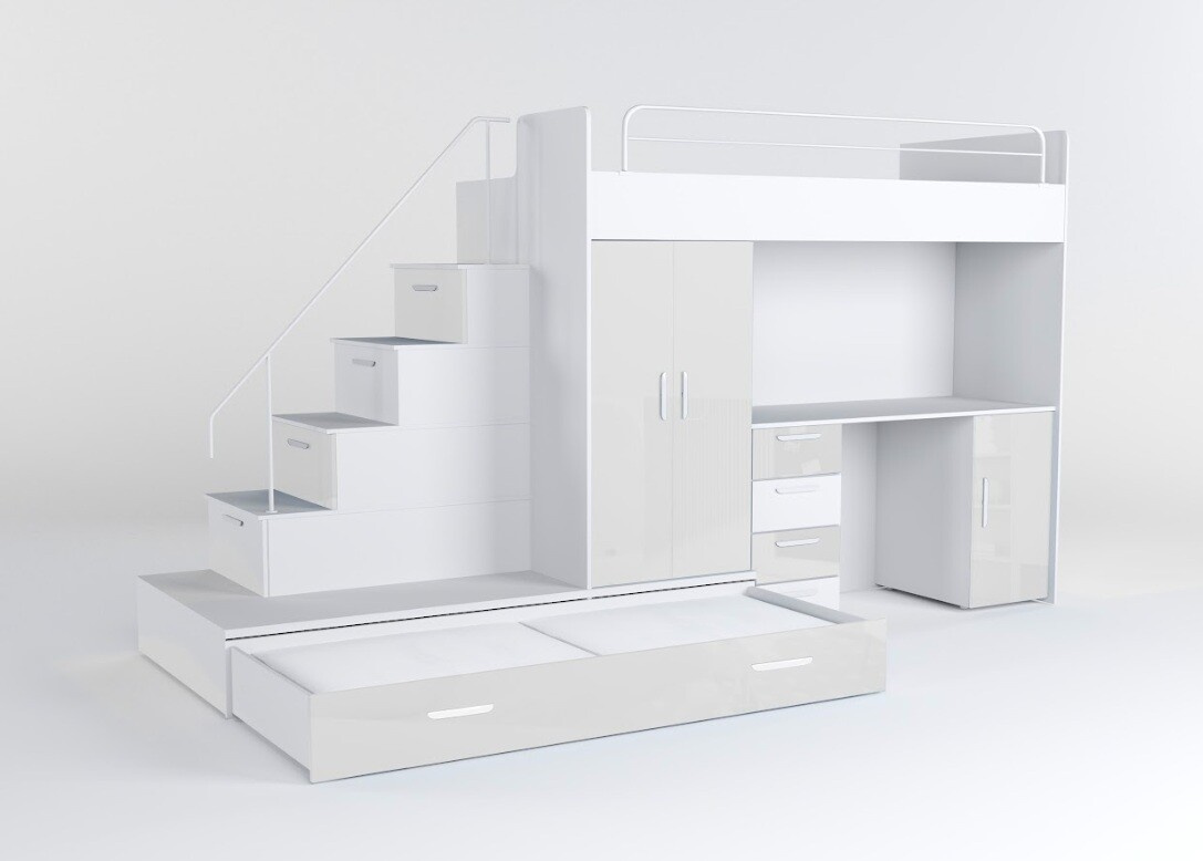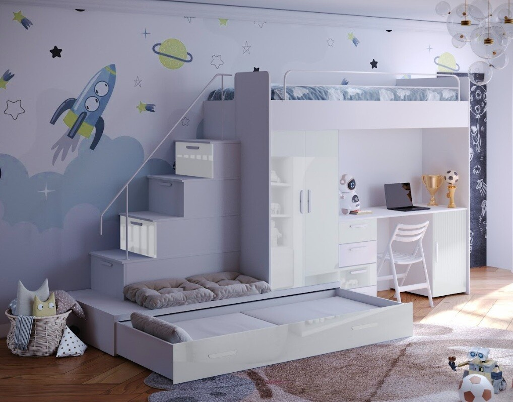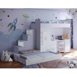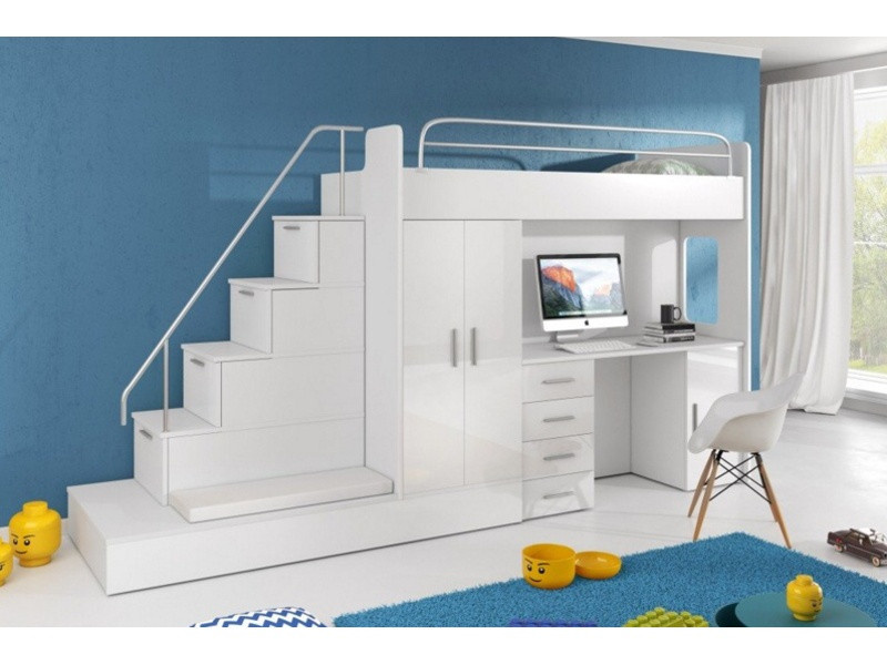 Tato postel je určená především pro osoby, které ocení moderní design, funkčnost a spoustu úložných prostorů. Patentované provedení a stabilní konstrukce postele Vám zaručuje bezpečí pro Vaše děti. Schody v sobě ukrývají spoustu úložného prostoru. Barevné provedení dvířek je v lesku a schůdky lze objednat jak na pravou tak i levou stranu (stranu schodů určujeme z čelního pohledu). Nosnost lůžka je 100 kg, nosnost schodu je 55 kg. Pod postelí se nachází psací stůl se šuplíky i šatní skříň včetně velkého výsuvného úložného šuplíku. K této posteli je možnost dokoupit další nábytek a utvořit tak krásný dětský pokoj. Uvedená úvodní fotografie je v Levém provedení.