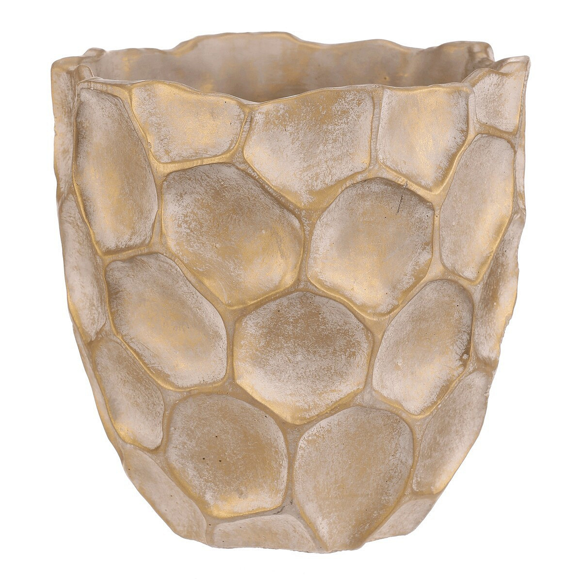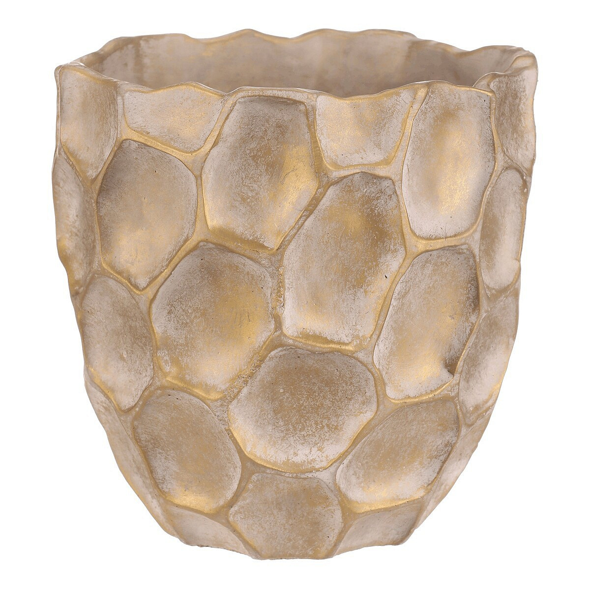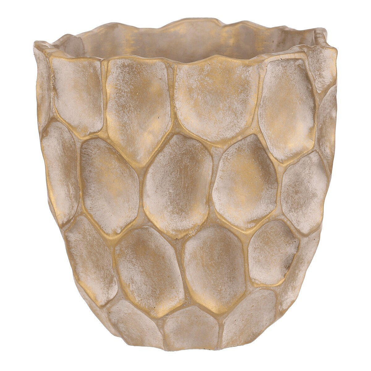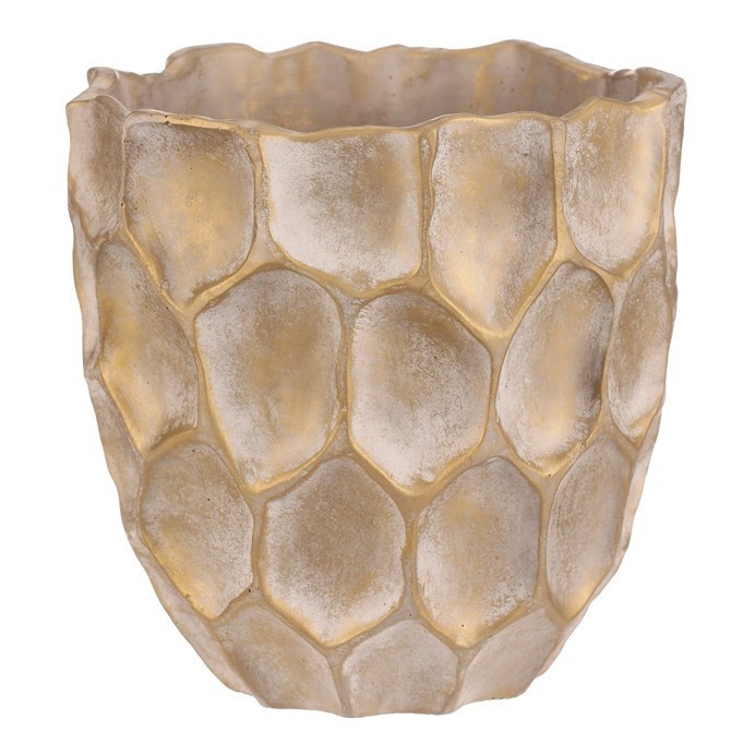 Béžovo-zlatý obal na květiny se vzorem připomínajícím plástev s nepravidelnými šestiúhelníkovými vzory, bude nádherným doplňkem zejména pro sváteční výzdobu. Je betonový, což zajišťuje jeho stabilitu, díky které bude pevným základem pro vaše oblíbené květiny, přízdoby a další dekorace.