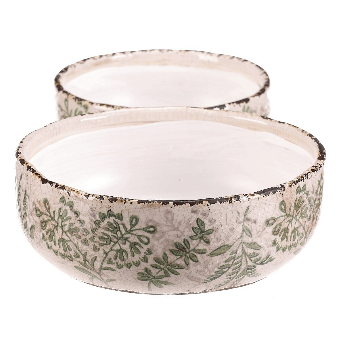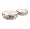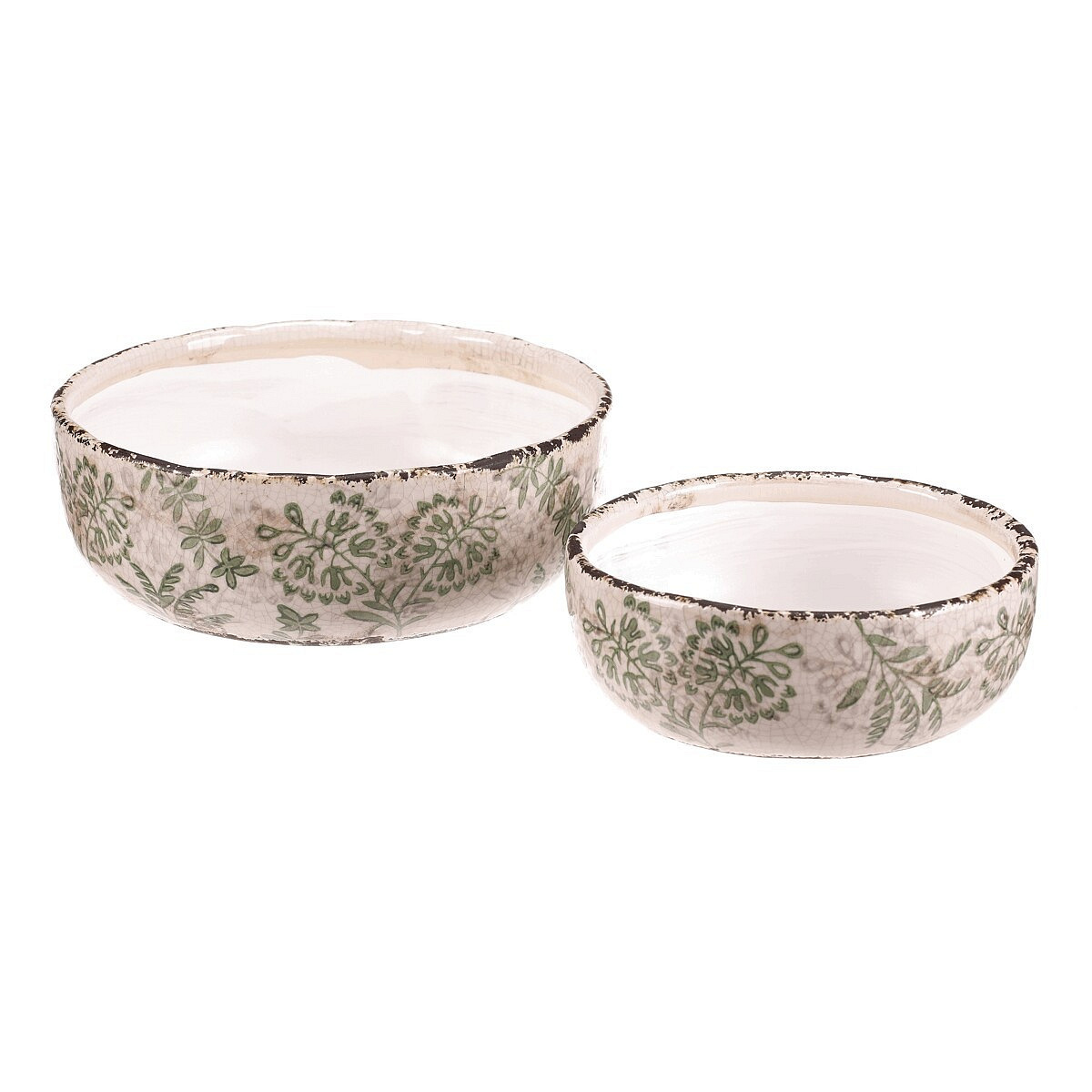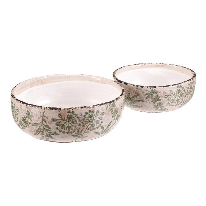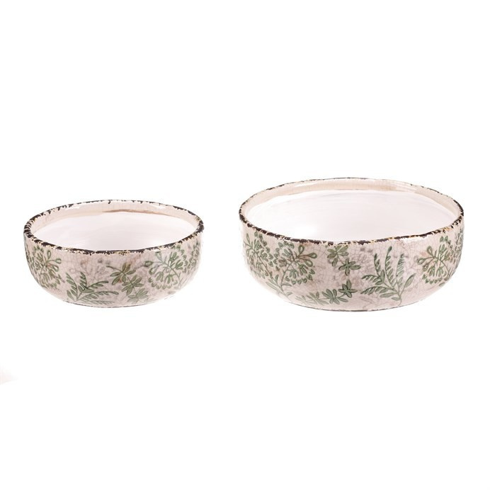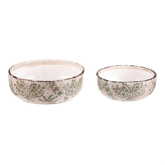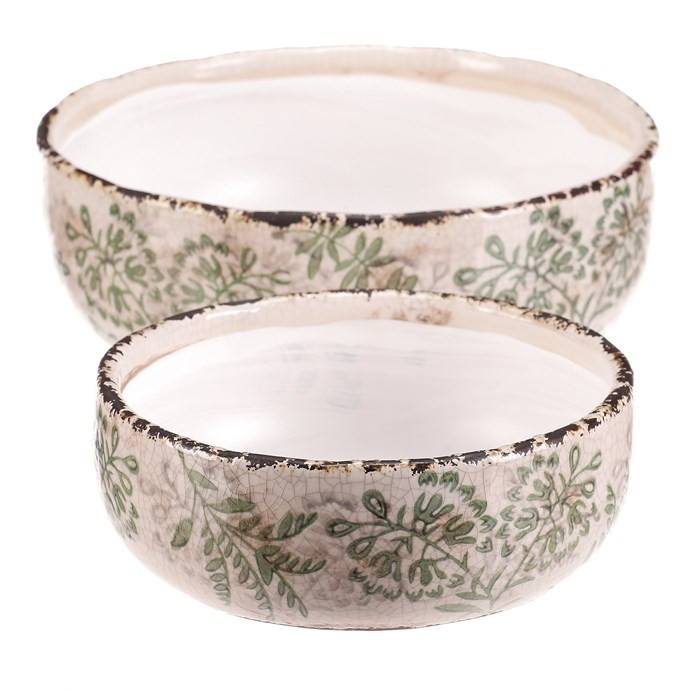Sada dvou keramických misek v krémovém odstínu s dekorativním motivem zeleně přináší do interiéru jemný přírodní akcent. Misky mají mírně nepravidelný tvar s jemně patinovaným okrajem, který podtrhuje retro styl provedení. Keramický materiál je snadno udržovatelný a vhodný pro různé využití, například jako obal na květináče nebo dekorativní nádoba. Vyniknou samostatně i ve dvojici, přičemž menší a větší miska nabízí variabilitu použití podle potřeby. Jejich povrch je hladký s decentní texturou, která dodává výrobku autentický vzhled.