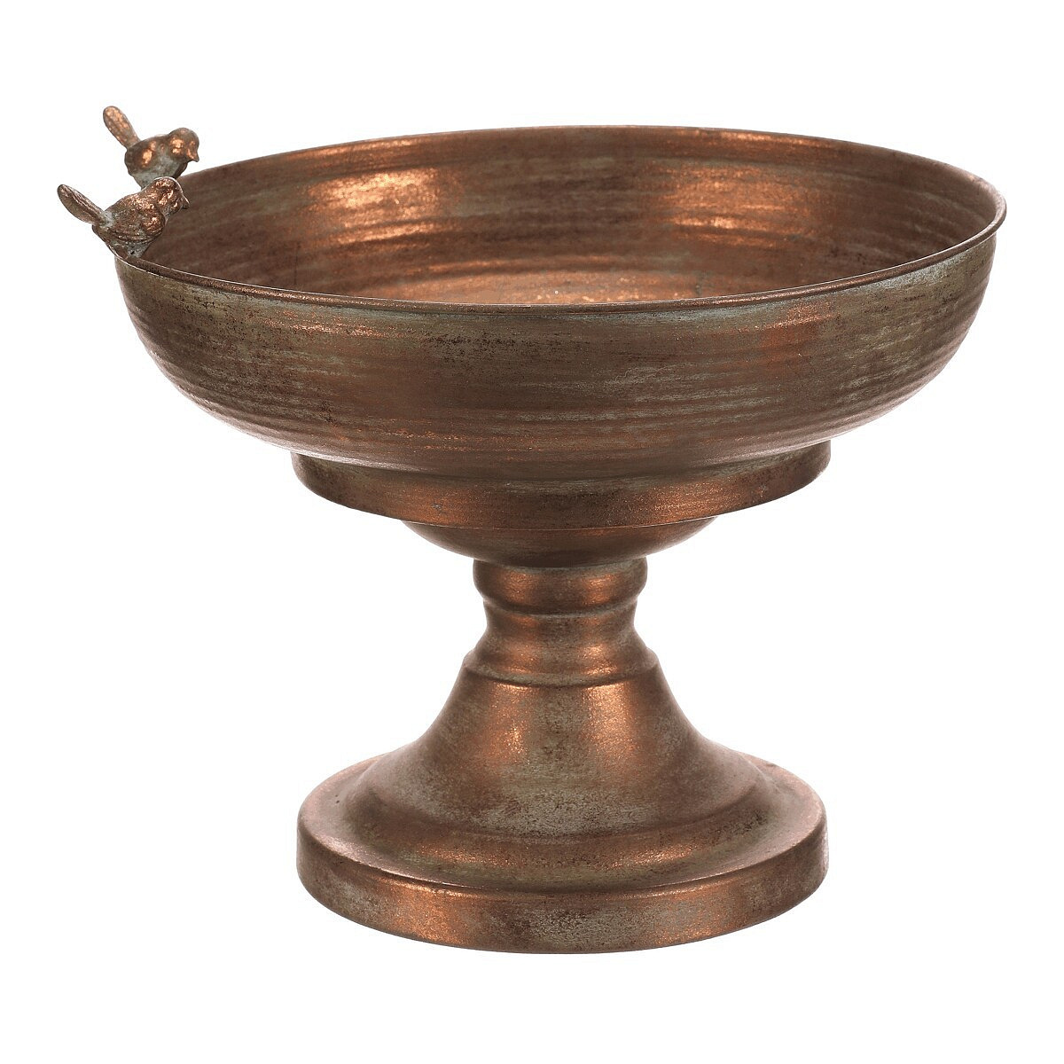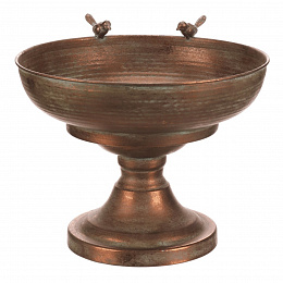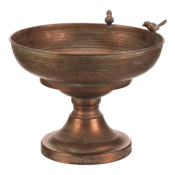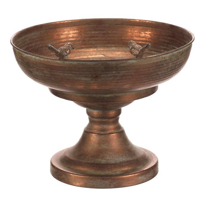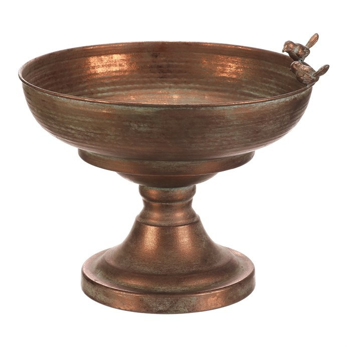 Kovový obal v měděném odstínu nabízí robustní provedení s jemně patinovaným povrchem, který dodává dekoraci nádech vintage stylu. Kulatá mísa na vysoké noze je ozdobena dvěma drobnými ptáčky na okraji, což přidává originální detail a vizuální efekt. Díky stabilní základně je vhodný pro umístění květin, dekorativních předmětů nebo jako samostatný designový prvek. Povrch se snadno udržuje a jeho materiál je navržen pro dlouhou životnost v interiéru i chráněném exteriéru. Velikost a tvar umožňují variabilní využití v různých typech prostorů.