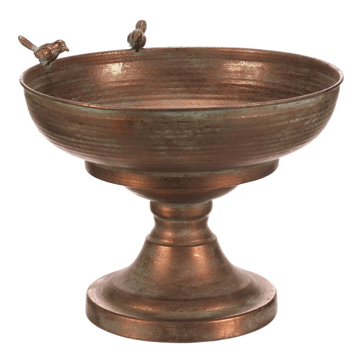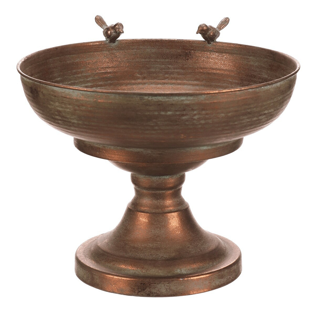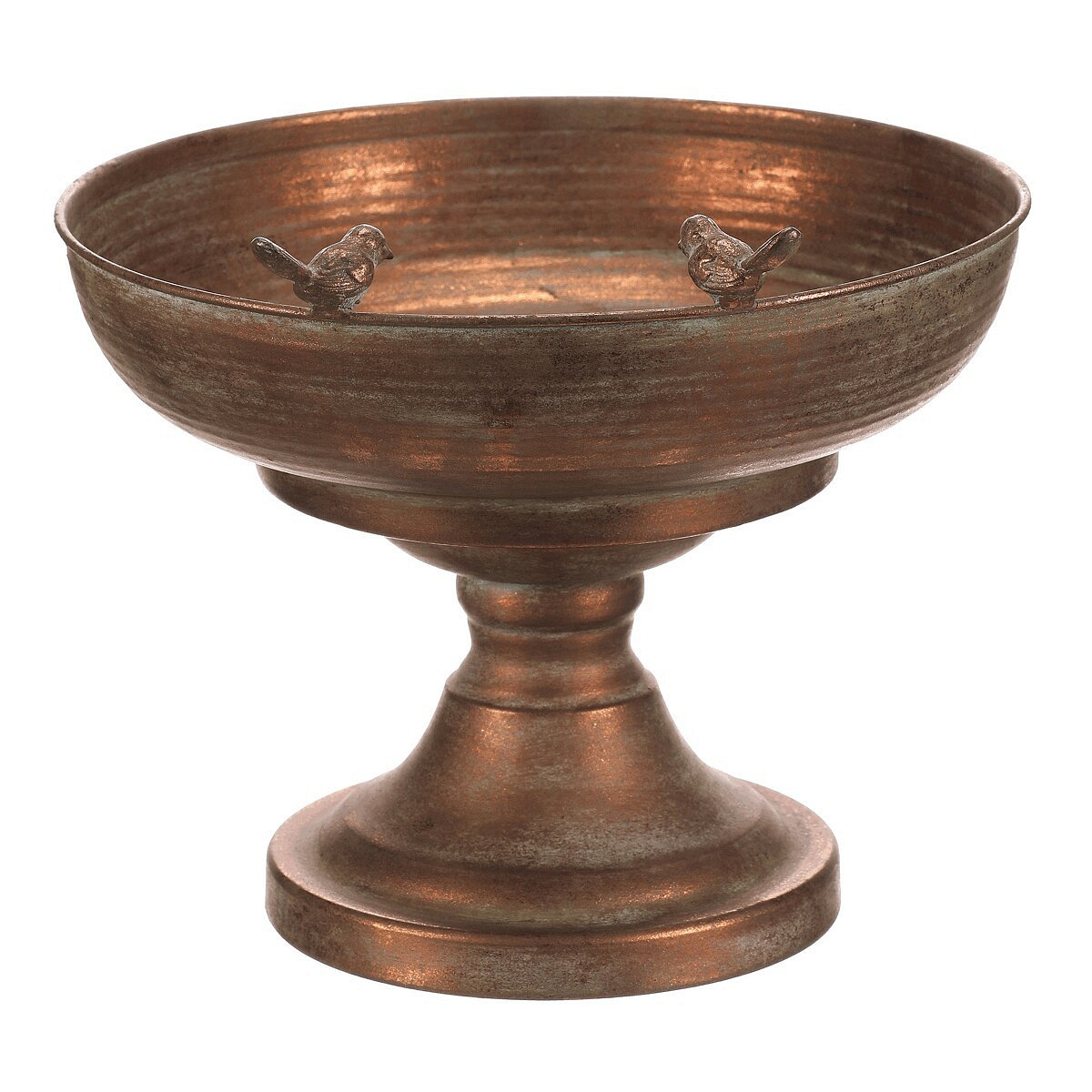 Kovový obal v měděném odstínu nabízí robustní provedení s jemně patinovaným povrchem, který dodává dekoraci nádech vintage stylu. Kulatá mísa na vysoké noze je ozdobena dvěma drobnými ptáčky na okraji, což přidává originální detail a vizuální efekt. Díky stabilní základně je vhodný pro umístění květin, dekorativních předmětů nebo jako samostatný designový prvek. Povrch se snadno udržuje a jeho materiál je navržen pro dlouhou životnost v interiéru i chráněném exteriéru. Velikost a tvar umožňují variabilní využití v různých typech prostorů.