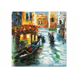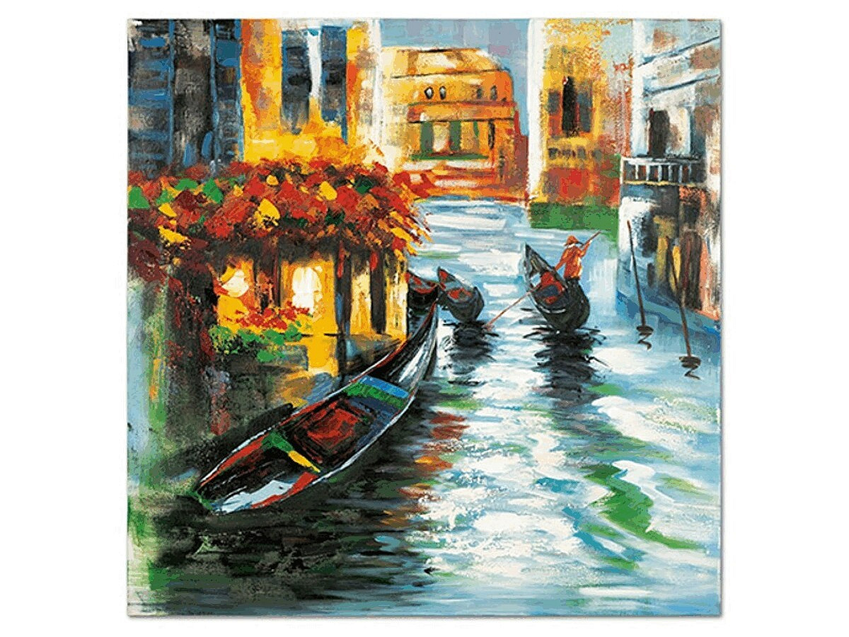 Ruční olejomalba na plátně zachycuje malebnou scenérii Benátek s typickými gondolami a živými barvami, které vytvářejí dynamický vizuální efekt. Vícebarevné provedení obrazu přináší do interiéru atmosféru italského města a působí jako výrazný dekorativní prvek. Plátno je napnuté na pevném rámu, což zajišťuje stabilitu a snadnou instalaci na stěnu. Díky kvalitnímu materiálu a technice malby je obraz navržen pro dlouhou životnost a snadnou údržbu.