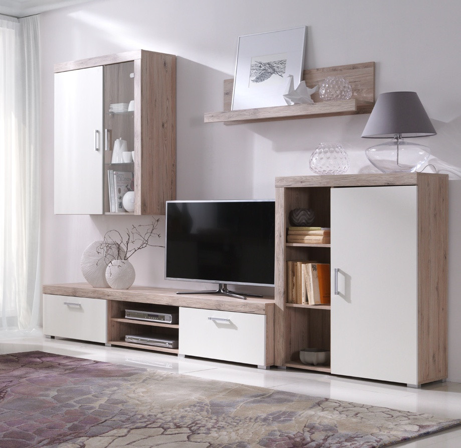 V ceně sestavy je TV stolek, závěsná vitrína, police a skříňka.