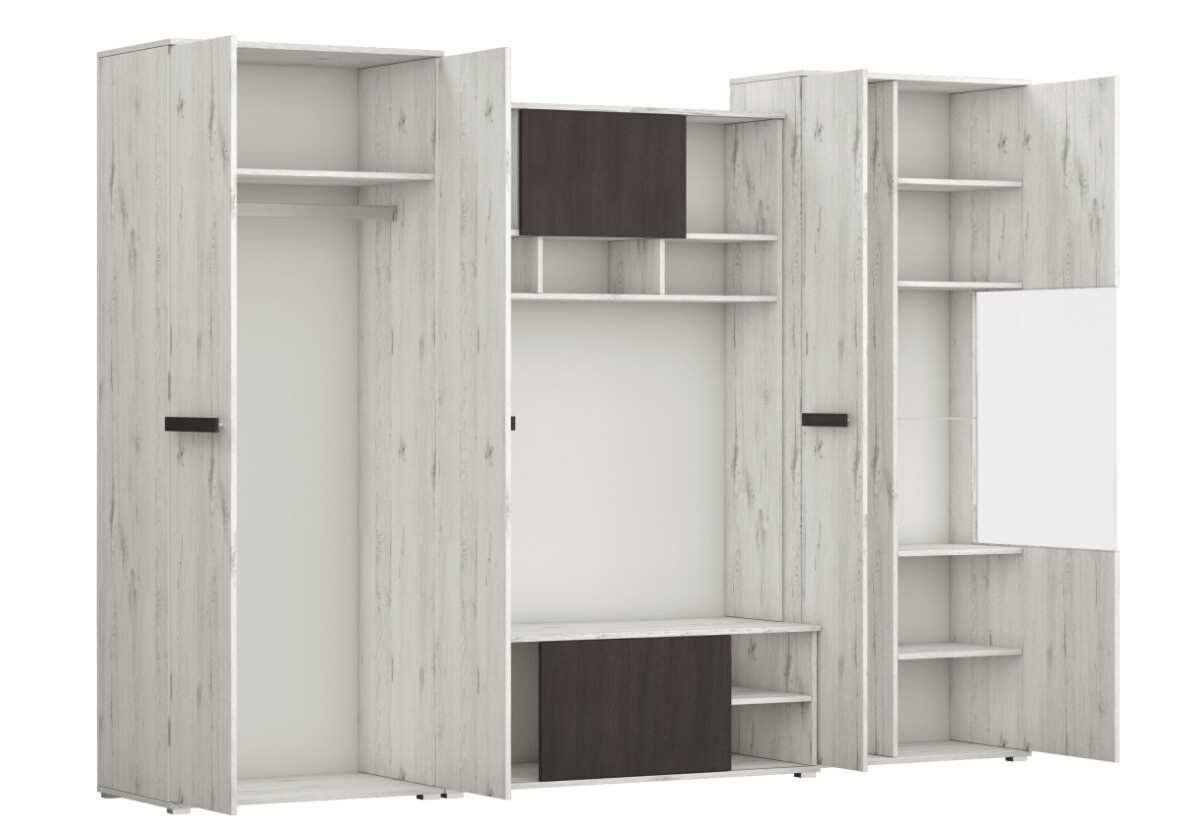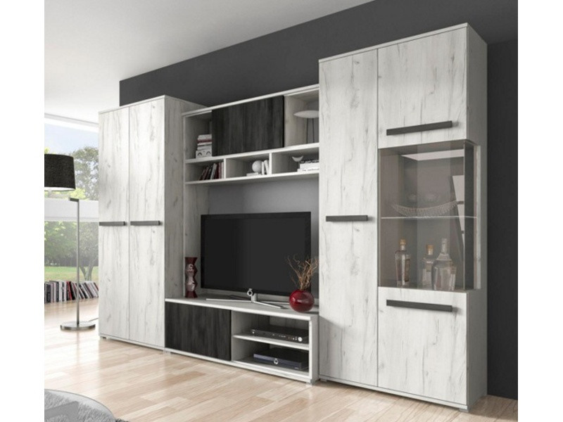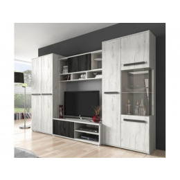 VIVA obývací stěna je univerzální a vhodná pro všechny typy interiérů. Je vyrobena z vysoce kvalitních laminovaných desek s ABS hranami. Celou obývací stěnu zdobí elegantní rukojeti.