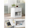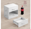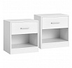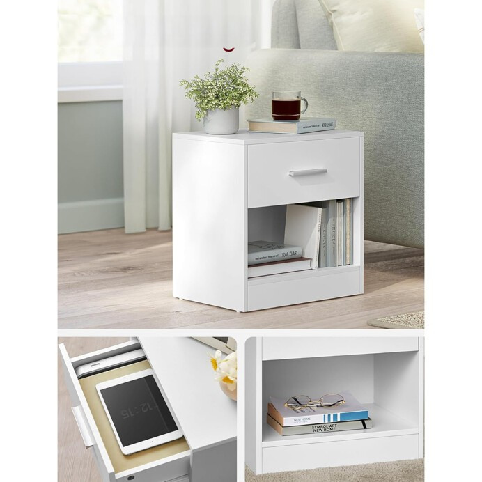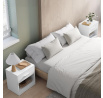 Sada dvou nočních stolků v bílém matném provedení je vyrobena z MDF desek, které zajišťují pevnost a snadnou údržbu. Každý stolek nabízí praktický úložný prostor v podobě zásuvky s kovovou úchytkou a otevřenou policí pod ní, což umožňuje pohodlné uspořádání drobností i knih. Kompaktní rozměry 39 × 28 × 41 cm umožňují snadné umístění vedle postele nebo v menších prostorách. Minimalistický design s čistými liniemi se hodí do různých stylů interiérů a díky kvalitnímu zpracování je sada navržena pro dlouhou životnost.