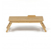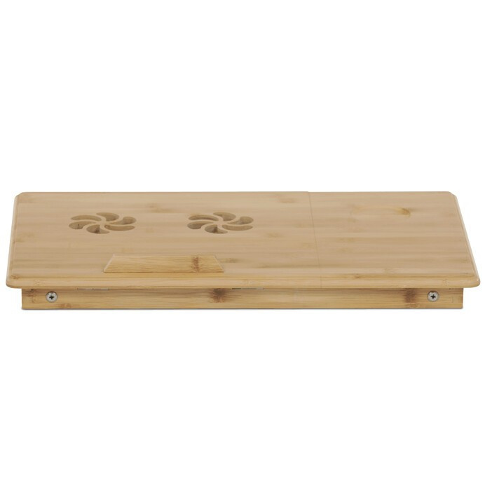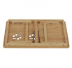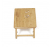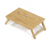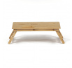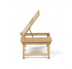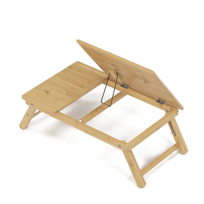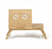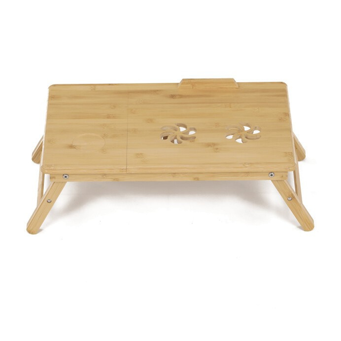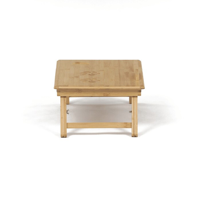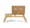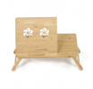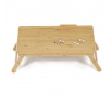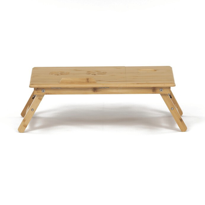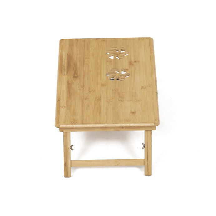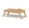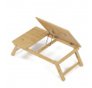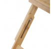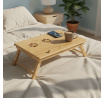 Skládací stolek na notebook z masivního bambusu v přírodním odstínu nabízí praktické a estetické řešení pro práci i odpočinek. Deska stolku je rozdělena na dvě části, přičemž hlavní část je nastavitelná do několika úhlů a opatřená větracími otvory pro lepší chlazení zařízení. Vedlejší plocha slouží jako odkládací prostor například na myš nebo šálek. Pevné nohy z masivního bambusu jsou vybaveny protiskluzovými koncovkami a umožňují snadné skládání pro úsporu místa při skladování či přepravě. Díky kvalitnímu přírodnímu materiálu se stolek snadno udržuje a je navržen pro dlouhou životnost.