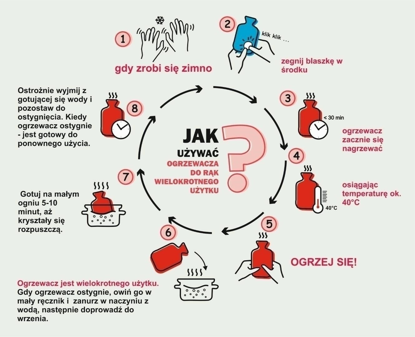 Opakovatelný ohřívač rukou je nutností této zimy! Ohřívač ve formě mini termoforu je vždy připraven zahřát naše ruce. Vlož ohřívač do tašky, batohu nebo kapsy a v okamžiku, kdy ho potřebuješ použít, stačí ho vyjmout a aktivovat jedním kliknutím na tabletu, která se nachází uvnitř. Pastilka umožní uvolnění tepla a během chvíle zahřeje naše ruce. Ohřívač byl zabalen do elegantní krabičky s návodem k použití, což z něj činí ideální dárek pro blízkou osobu. Jak funguje ohřívač? Ohřívač je aktivován několikanásobným ohnutím kovové destičky. Dochází k krystalizaci kapaliny a ohřívač začíná vytvářet teplo na přibližně. 30 minut. Opětovné použití: Když je ohřívač studený, ponořte ho do nádoby s vodou, poté přiveďte k varu. Vařte na mírném ohni 5-10 minut, dokud se krystaly nerozpustí. Opatrně vyjměte z vařící vody a nechte vychladnout. Rozměry balení: 7,8x17,5x1,5cm