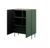 knihovna 2D2SZ rozměry: V./šířka./ dg.127cm/98cm/45cm Materiál: korpus: černá 16 mm laminovaná deska čela: černá 18 mm MDF frézovaná deska + černá matná PVC fólie horní deska: 16 mm řemeslně laminovaná deska zadní deska: černá 3 mm HDF deska panty: měkké zavírání nožky: černá ocel výška: 2 mm 200 mm, průměr úchytů 20 mm: čela vyčnívají nad horní panel