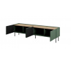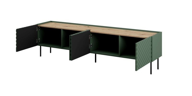 rozměry skříně 4D RTV: stojící skříň: V./šířka./ dg.54cm/200cm/40cm nástěnná skříňka: V./šířka./ dg.35cm/200cm/40cm Materiál: tělo: černá 16mm laminovaná deska čela: černá 18mm frézovaná MDF deska + černá matná PVC fólie horní deska: 16mm řemeslně laminovaná deska zadní deska: černá 3mm HDF deska panty: tiché zavírání nožky: ocelové černé výška: 2 mm 200 mm, průměr úchytů 20 mm: čela vyčnívají nad horní panel