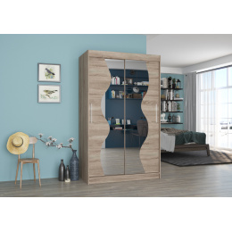 Posuvná skříň se zrcadlem OSWALD je ideálním způsobem, jak uspořádat prostor. Nábytek je vybaven prostornými policemi a tyčí, na kterou můžete pověsit šaty, obleky, svrchní oděvy nebo košile. Na čelní straně byla připevněna zrcadla ve tvaru vlny, která opticky zvětšují prostor a zároveň dodávají jedinečný styl. Díky tomu, že skříň je posuvná, nemusíte vyčleňovat další místo na otevření dveří, což z ní činí ideální řešení pro malý pokoj nebo úzkou předsíň.
