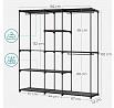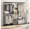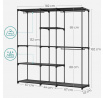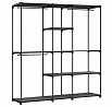 Otevřená šatní skříň v černém provedení nabízí praktické řešení úložného prostoru pro oděvy a doplňky. Je vyrobena z pevného kovu s plastovými a látkovými prvky, které zajišťují stabilitu a snadnou údržbu. Konstrukce obsahuje několik polic a věšáků, které umožňují efektivní organizaci oblečení, včetně zavěšení košil, kabátů či sukní. Díky otevřenému designu je přístup k uloženým věcem rychlý a přehledný, což usnadňuje každodenní používání. Rozměry a nosnost odpovídají potřebám běžné domácnosti či kanceláře.