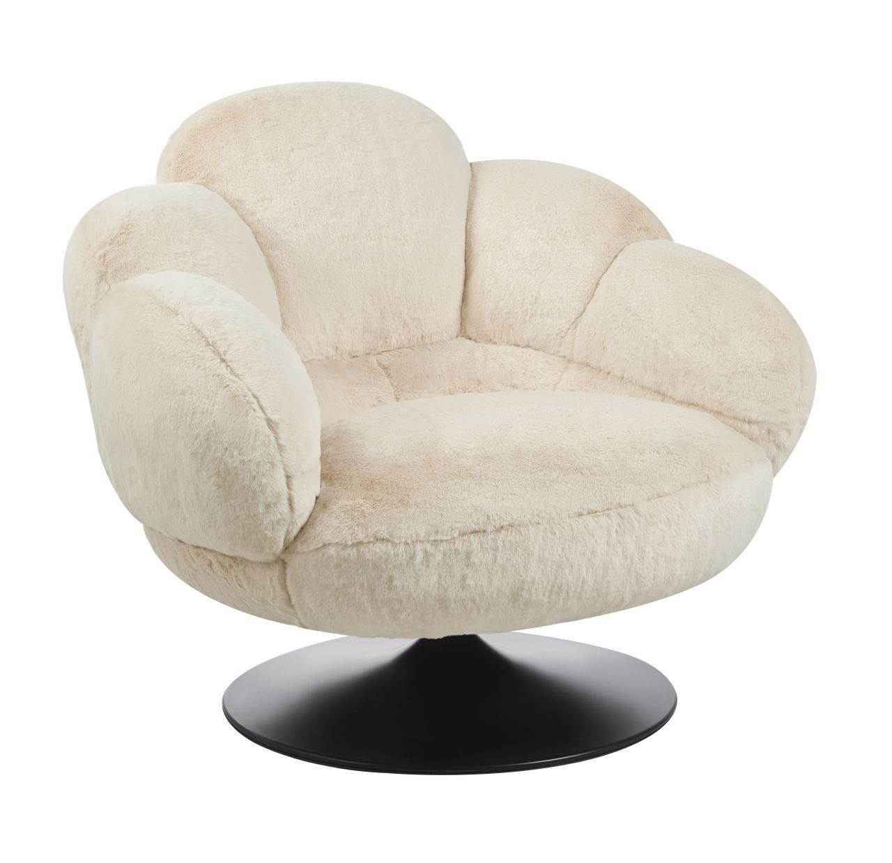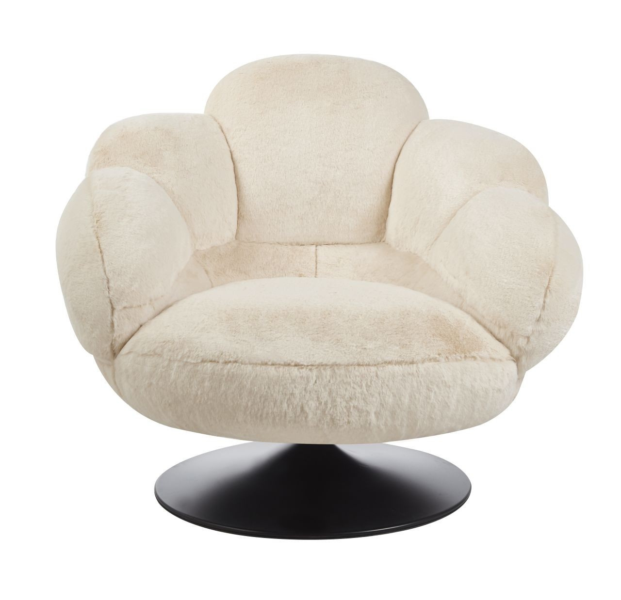 Křeslo má sedadlo otočné v rozsahu 360 stupňů.Rozměry: - celková výška: 78 cm - celková šířka: 96 cm - celková hloubka: 92 cm - hloubka sedáku: 55 cm - šířka sedáku: 55 cm - výška sedáku: 39 cm - průměr základny: 60 cm Materiál - sedák: kožešinová tkanina - rám: kov lakovaný práškovou barvou Barva: - sedák: béžový - základna: černá