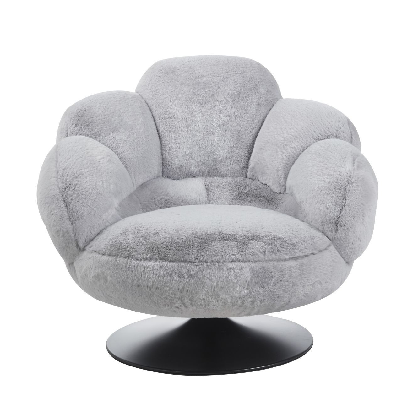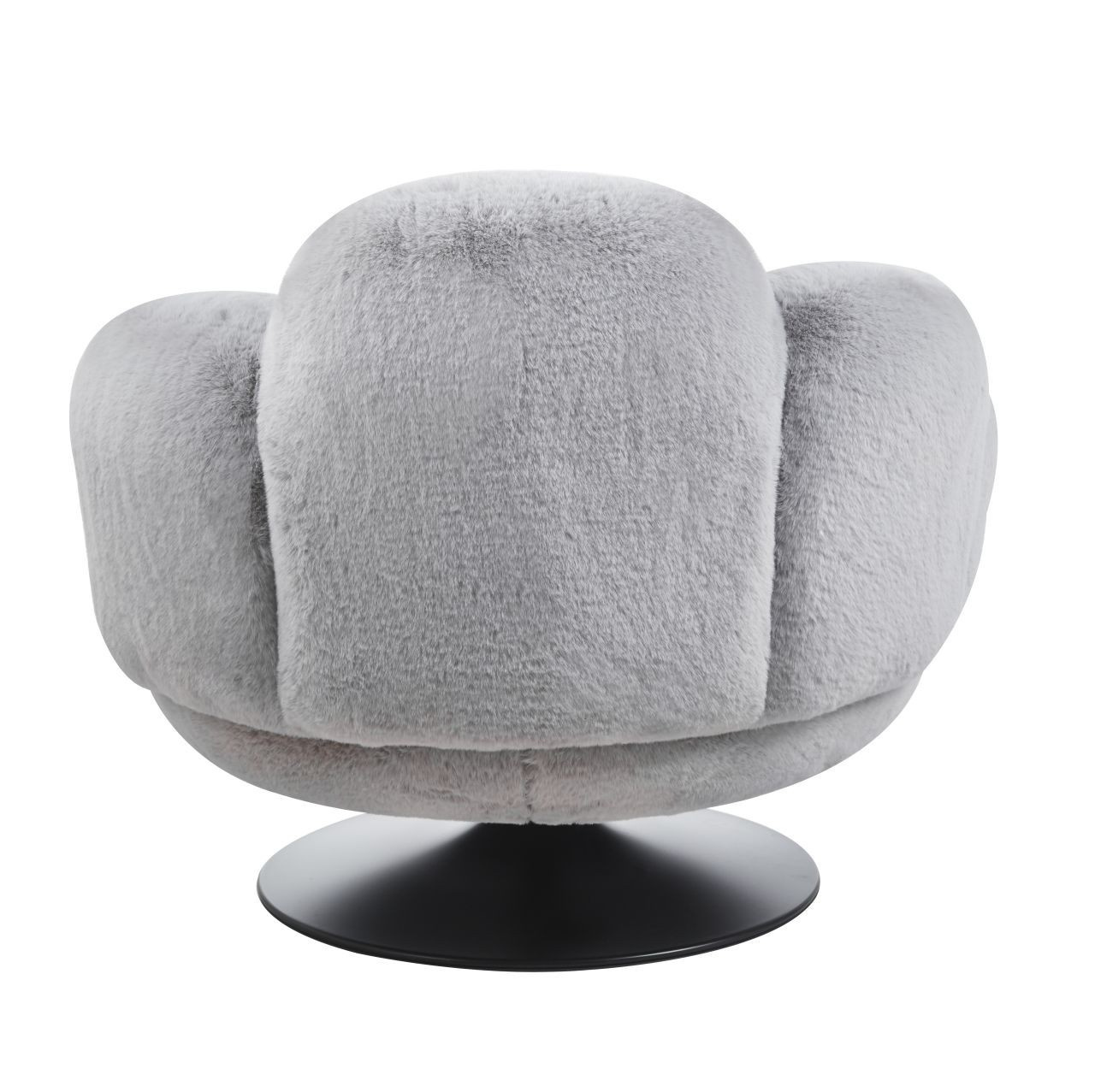 Křeslo má sedadlo otočné v rozsahu 360 stupňů.Rozměry: - celková výška: 78 cm - celková šířka: 96 cm - celková hloubka: 92 cm - hloubka sedáku: 55 cm - šířka sedáku: 55 cm - výška sedáku: 39 cm - průměr základny: 60 cm Materiál - sedák: kožešinová tkanina - rám: kov lakovaný práškovou barvou Barva: - sedák: šedý - základna: černá