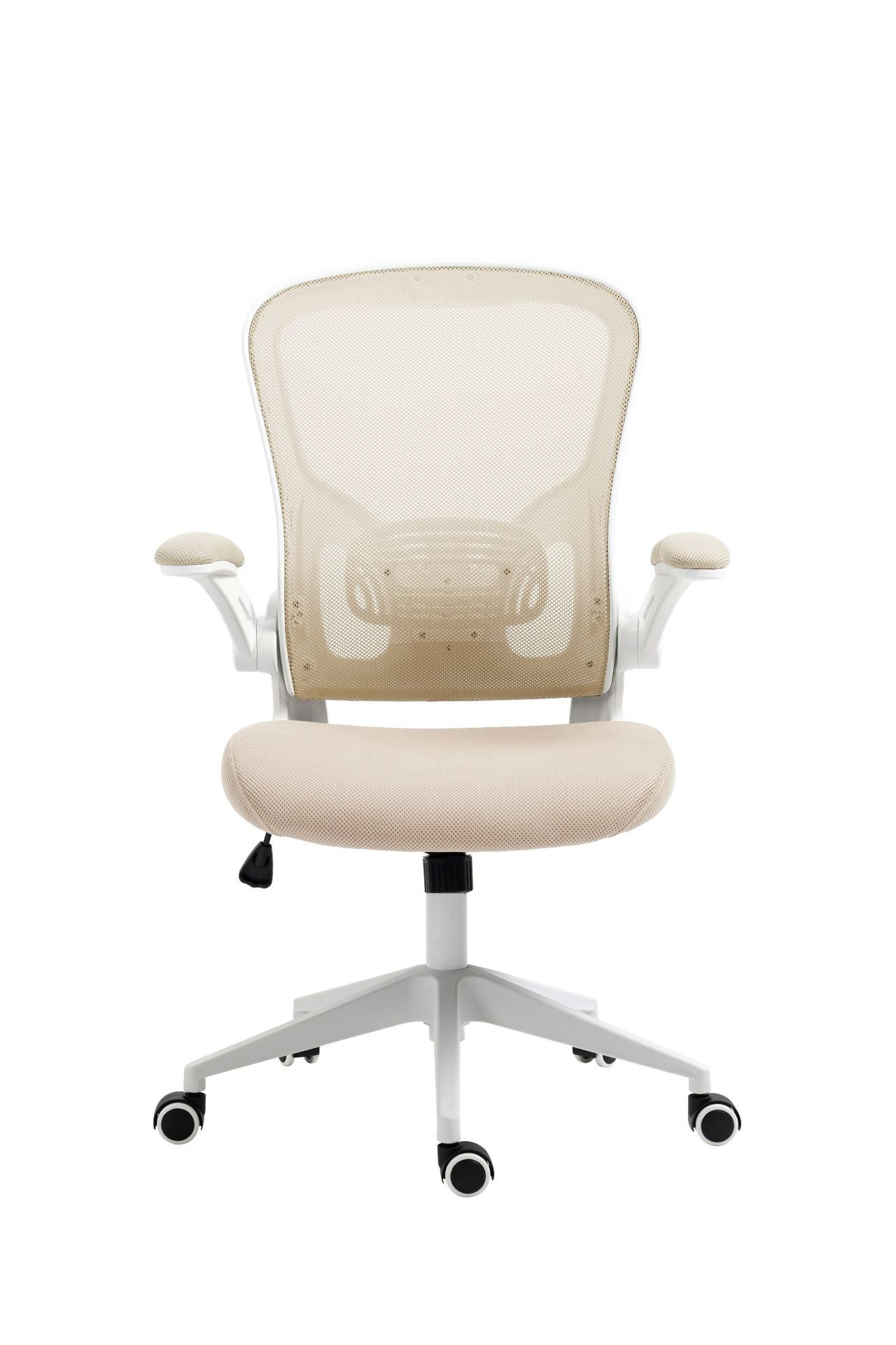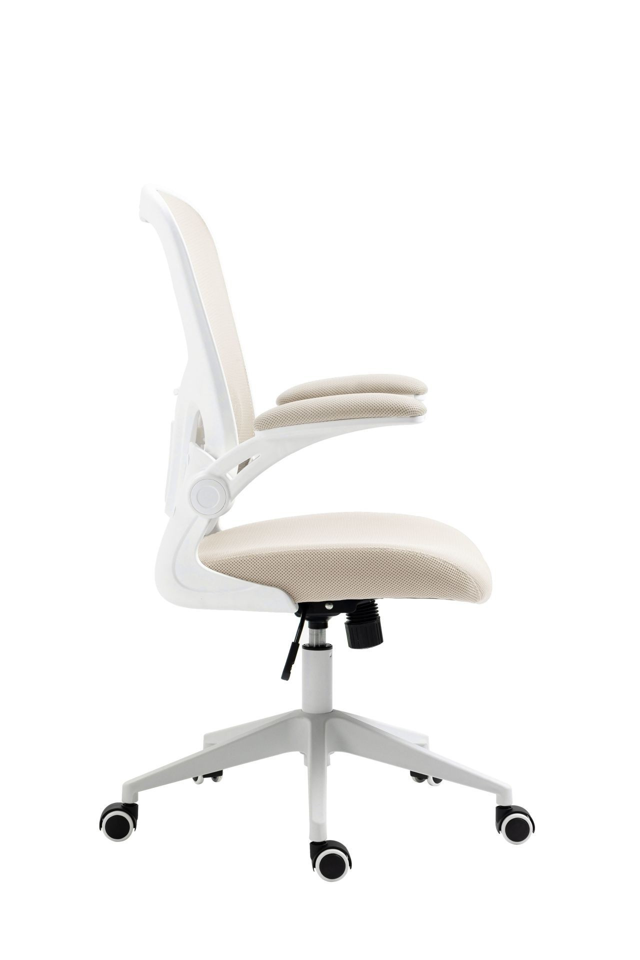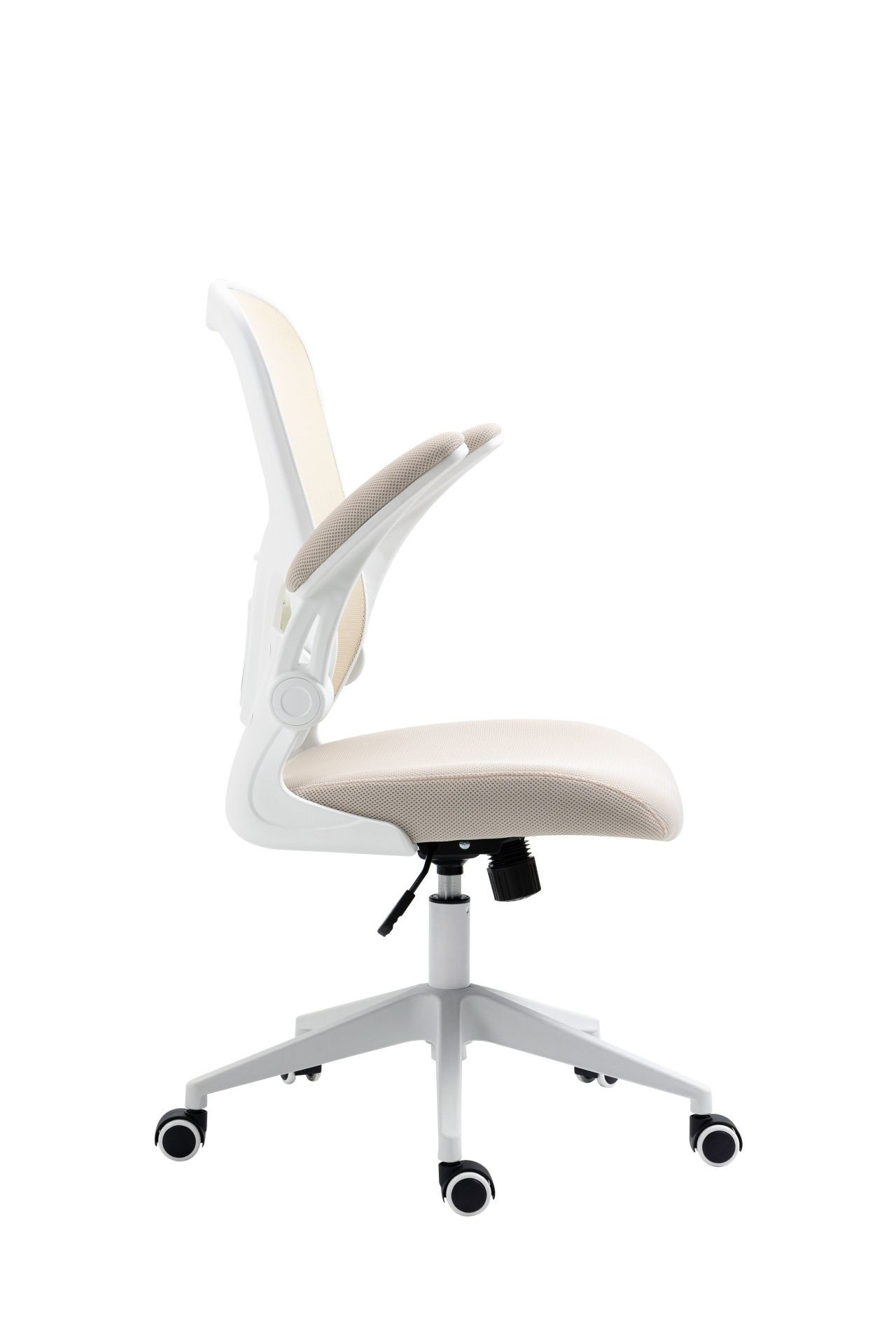 Rozměry: - celková šířka: 64 cm - šířka sedáku: 50 cm - hloubka sedáku: 44 cm - šířka opěradla: 50 cm - výška opěradla: 55 cm - celková výška: 96-110 cm - výška sedáku: 45-55 cm - výška područek: 69-79 cm Materiál: - čalounění: membránová tkanina + síťovina - základna a kolečka: PP plast Barva: - sedák + opěradlo: béžová - základna + područky: bílá Další: - mechanismus TILT - zvedací (skládací) područky