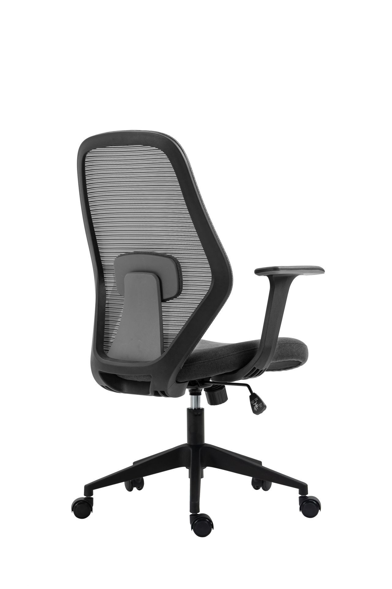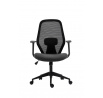 Rozměry: - celková šířka: 65 cm - šířka sedáku: 50 cm - hloubka sedáku: 44 cm - šířka opěradla: 46 cm - výška opěradla: 67 cm - celková výška: 97-107 cm - výška sedáku: 43-53 cm - výška područek: 66-76 cm Materiál: - čalounění: látka + síťovina - základna a kolečka: plast PP Barva: - sedák: tmavě šedá - opěradlo: černá - základna + područky: černá Ostatní: - mechanismus TILT - pevné područky