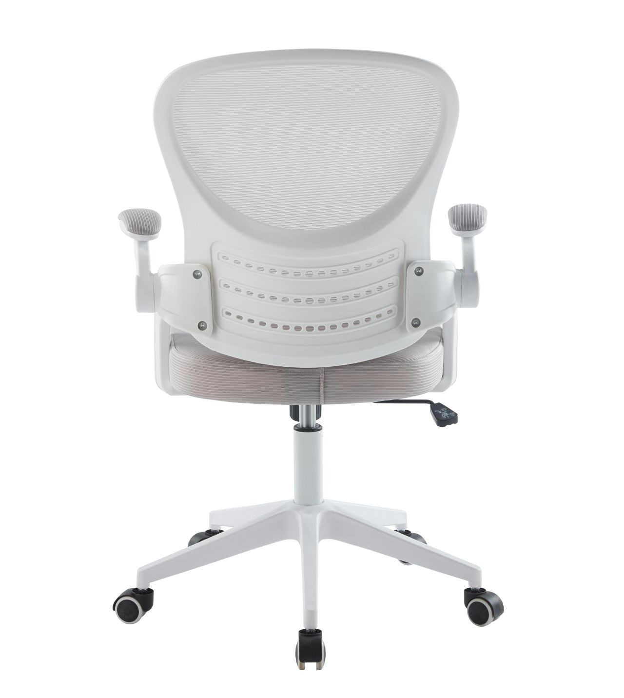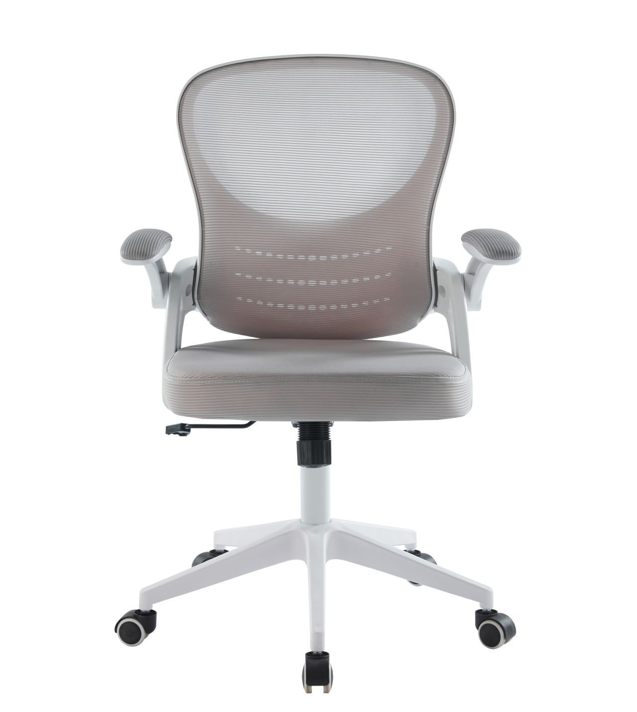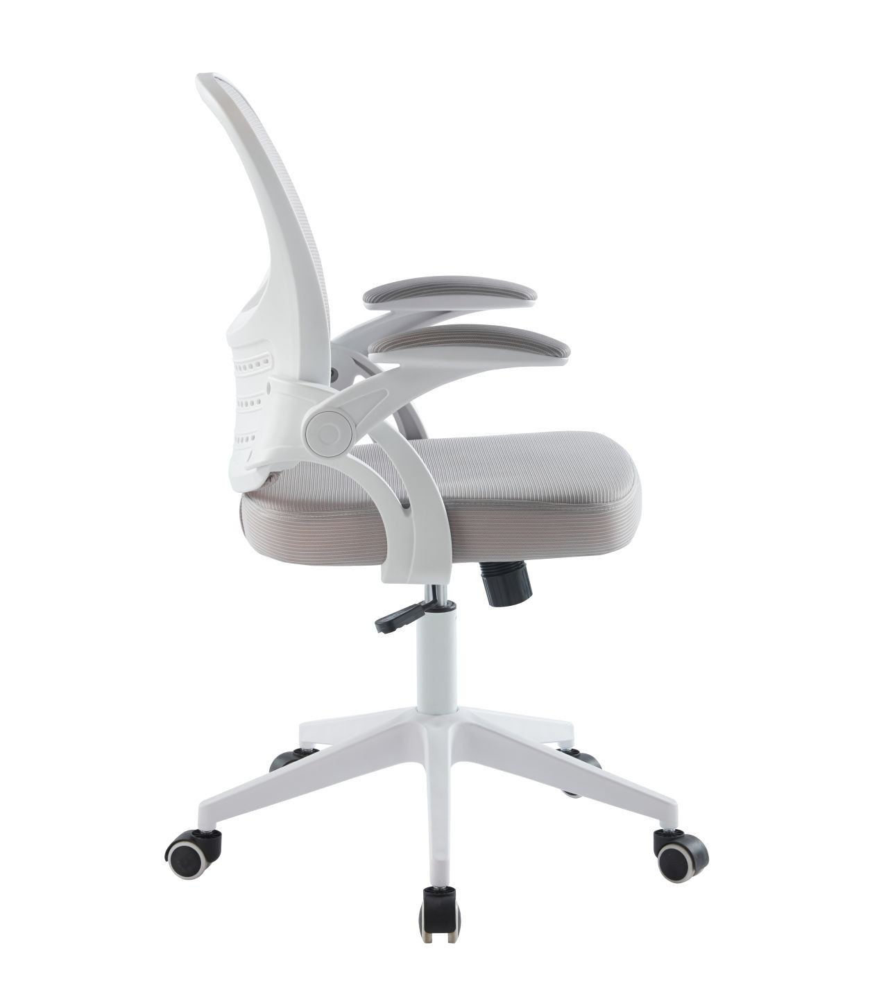 Rozměry: - celková šířka: 65 cm - šířka sedáku: 49 cm - hloubka sedáku: 47 cm - šířka opěradla: 51 cm - výška opěradla: 49 cm - celková výška: 97-107 cm - výška sedáku: 49-59 cm - výška područek: 69-79 cm Materiál - čalounění: membránová tkanina + síťovina - základna: PP plast Barva: - sedák + opěradlo: šedá - základna + područky: bílá Další: - mechanismus TILT - zvedací (skládací) područky