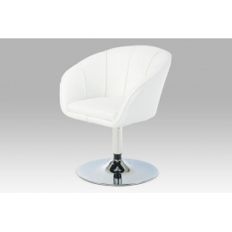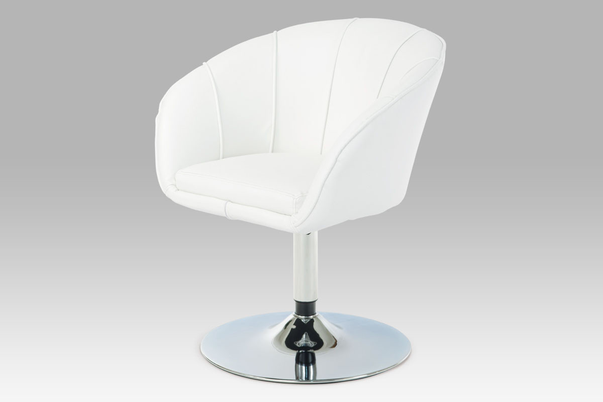 Konferenční křeslo v potahu z bílé ekokůže s dekorativním řasením na vnitřní straně zvýšeného korpusového opěráku a s paspulí po obvodě. Svým designem se řadí do retro stylu. Křeslo je otočné o 360° bez aretace a vratného mechanismu. Konstrukce je kovová, výplň je z kvalitní PU pěny. Sedák korpusu je pro zvýšení pohodlí zdvojený a hladký Světlá výška křesla je 37 cm, područky začínají ve výšce 60 cm a plynule přecházejí až do celkové výšky křesla a to je 75 cm. Křeslo je umístěno na centrální noze a velkým, 50 cm kovovým talířem, který bezpečně zaručuje výbornou stabilitu. Ze spodní strany je opatřen po obvodě plastovým páskem tvořící „kluzák“, který zabraňuje možnosti poškození povrchu tvrdých podlah a zároveň slouží i jako protismyková pojistka. Kovové součásti jsou v povrchové úpravě lesklý chrom. Nosnost je až 120 kg. Toto křeslo můžete použít nejen do konferenčních místností a konferenčním stolkům, je vhodné i k jídelním stolům a pracovním stolům, ale výborné uplatnění najde i jako solitér.