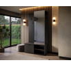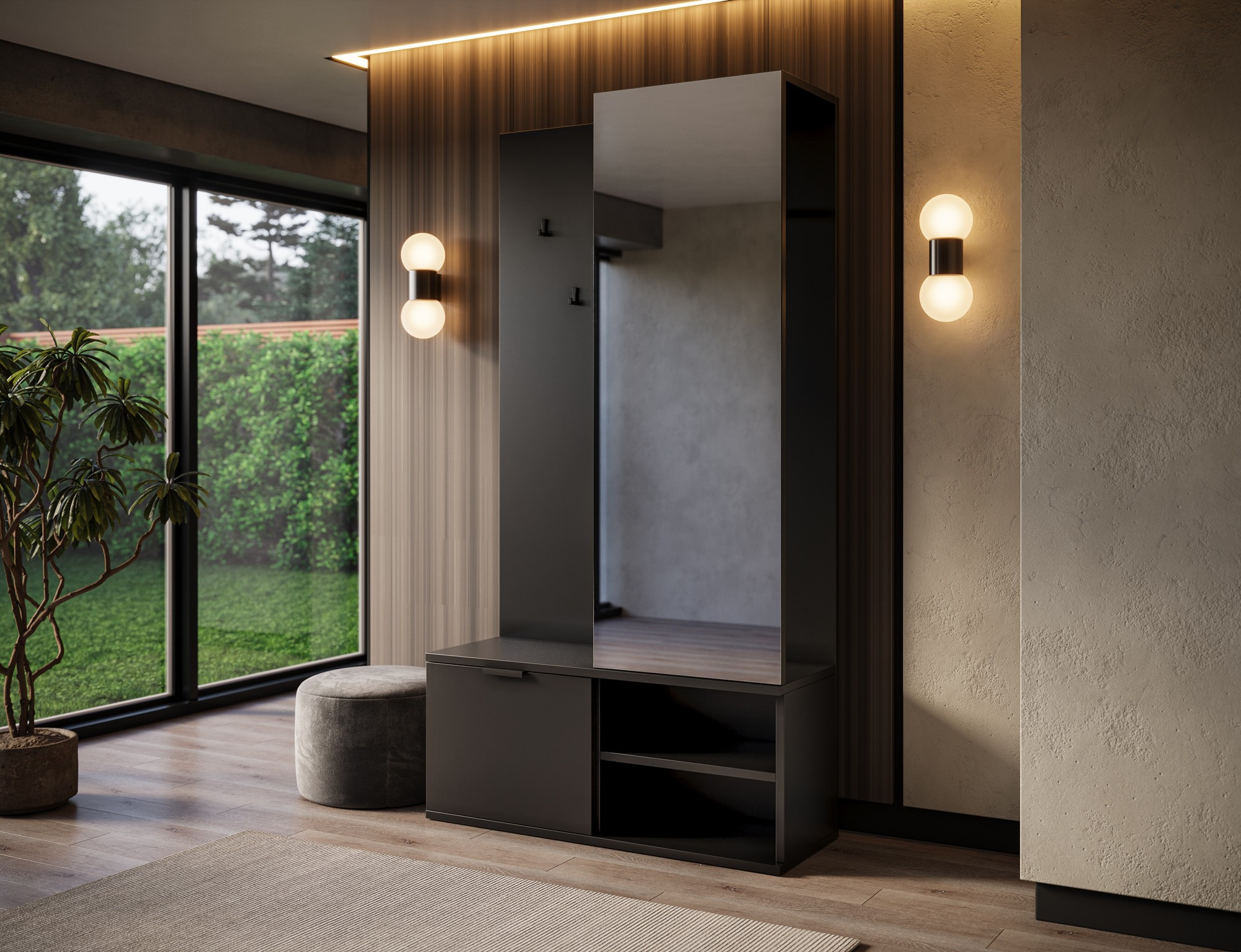 Chodbaová skříň Oturra je moderní, štíhlý kus nábytku, který kombinuje věšák na kabáty, zrcadlo a úložný prostor na boty v jednom elegantním celku. Se šířkou 100 cm, výškou 189 cm a hloubkou 35 cm funguje отлично i v úzké chodbě, což pomáhá udržovat vstupní prostor uklizený. Horní část obsahuje lištu pro ramínka na bundy a kabáty, spolu s kovovým nábytkovým háčkem na doplňky, zatímco spodní část nabízí praktickou skříňku a dvě police na boty nebo jiné předměty. Šatní skříň Oturra je vyrobena z odolné laminované desky: čela, korpus a zadní/vnitřní panely jsou všechny vyrobeny ze stejného materiálu a hrany jsou zakončeny PVC, což zvyšuje odolnost proti poškození a usnadňuje čištění. Korpus a police jsou silné 16 mm a celá jednotka váží 53 kg, což zajišťuje stabilitu a pevnou kvalitu po mnoho let. Je to ideální volba, pokud hledáte funkční minimalistickou předsíňovou skříň se zrcadlem, tyčí na oblečení a úložným prostorem na boty.