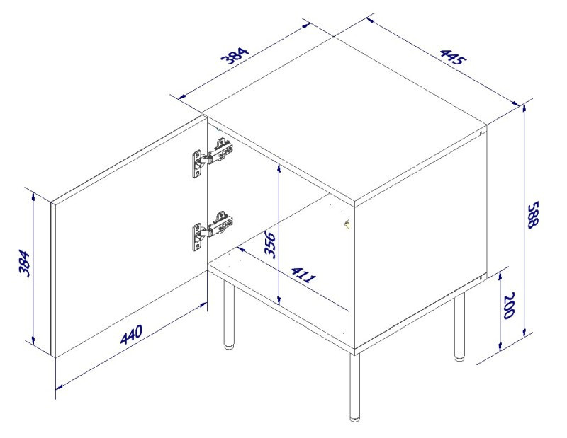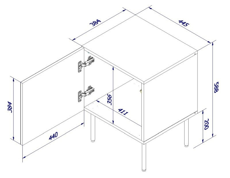 noční stolek ( 2 ks. = 1 kpl. ) rozměry: š/s/g-cm/cm/cm, materiál: Kostra: 16mm matná laminovaná deska Čelo: 16mm MDF deska Nohy: kovové, černé, výška 20 cm Úchyty: systém PUSH - CLICK