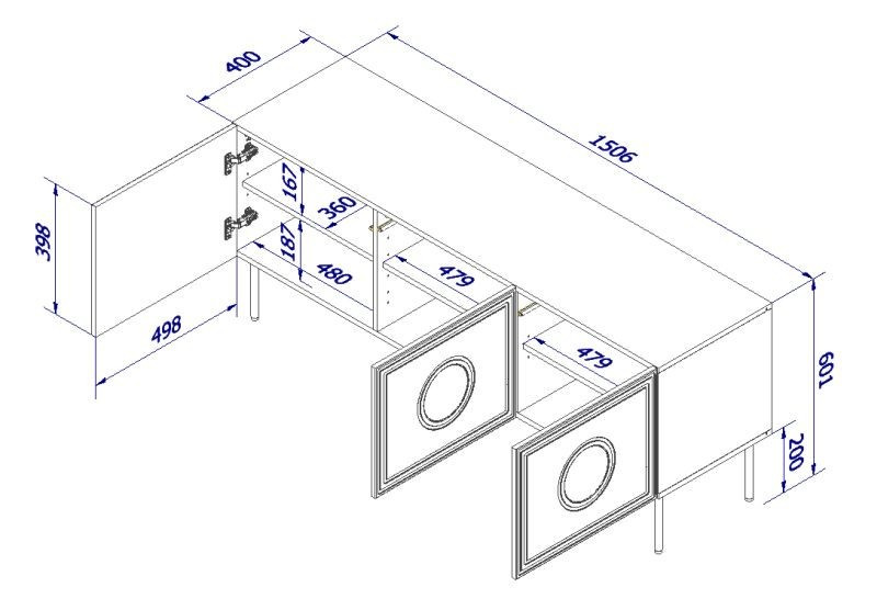 skříňka RTV 150 (3D) Rozměry: š/š/g-cm/cm/cm Materiál: Kostra: 16mm matná laminovaná deska Čela: 16mm MDF deska Nohy: kovové, černé, výška 20 cm Úchyty: systém PUSH - CLICK
