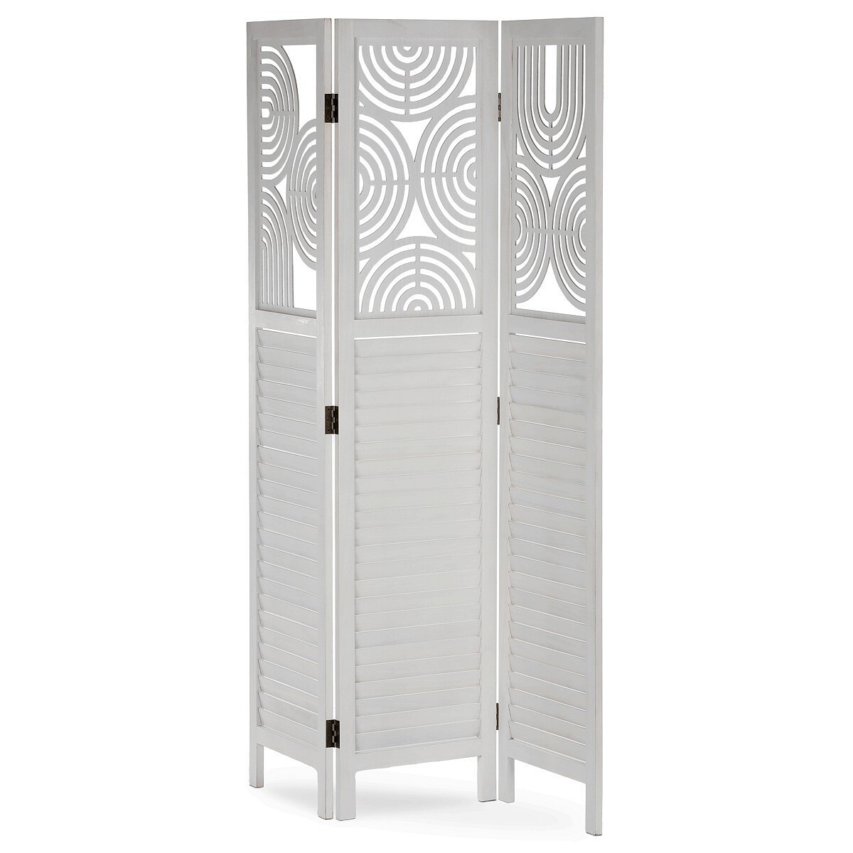 Třípanelový paraván vyrobený z masivního smrkového dřeva v bílé barvě nabízí praktické řešení pro rozdělení prostoru v interiéru. Každý díl je doplněn dekorativními výřezy v horní části, které propouštějí světlo a zároveň zachovávají soukromí. Masivní materiál zajišťuje pevnost a stabilitu, zatímco přírodní textura dřeva dodává výrobku přirozený vzhled. Paraván je vhodný pro použití v obývacích pokojích, ložnicích nebo kancelářích, kde pomáhá vytvořit útulné a funkční prostředí. Díky skládací konstrukci je snadno přemístitelný a skladovatelný.