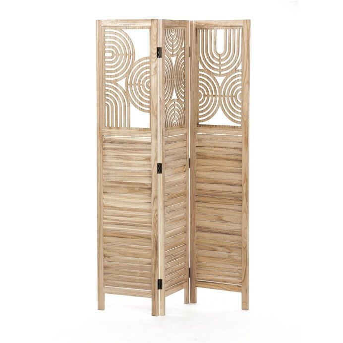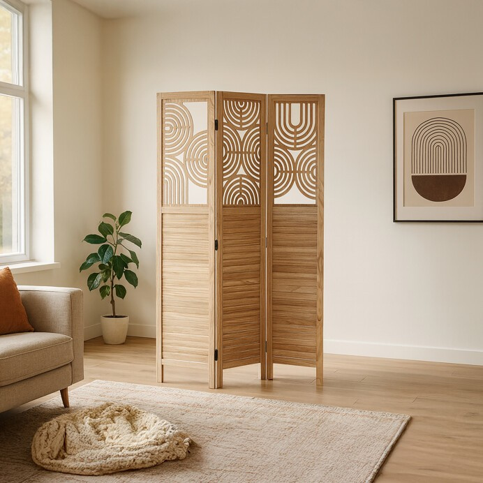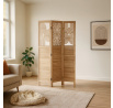 Třídílný dřevěný paraván z masivu smrku v přírodním odstínu kombinuje pevné provedení s dekorativní perforací horní části, která vytváří zajímavý vizuální efekt. Každá část je spojena kovovými panty umožňujícími flexibilní nastavení úhlu a snadné přenášení či skladování. Paraván slouží jako praktický prvek pro rozdělení prostoru nebo zvýšení soukromí v interiéru, přičemž přírodní dřevěný dekor přináší do místnosti teplý a přirozený vzhled. Povrch je upraven tak, aby materiál byl snadno udržovatelný a odolný vůči běžnému opotřebení. Rozměry a konstrukce zajišťují stabilitu a dlouhou životnost produktu.