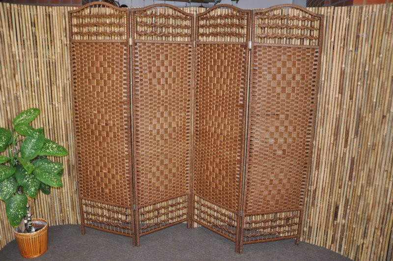 Čtyřdílný paravan je nejen vhodným bytovým doplňkem ale slouží zároveň k oddělení části vnitřních protor | Výška paravanu je 180 cm. Paravan se skládá ze čtyřech dílů šíře 50 cm. Materiál konstrukce je dřevo, výplet je tvořen barevnými papírovými provázky.