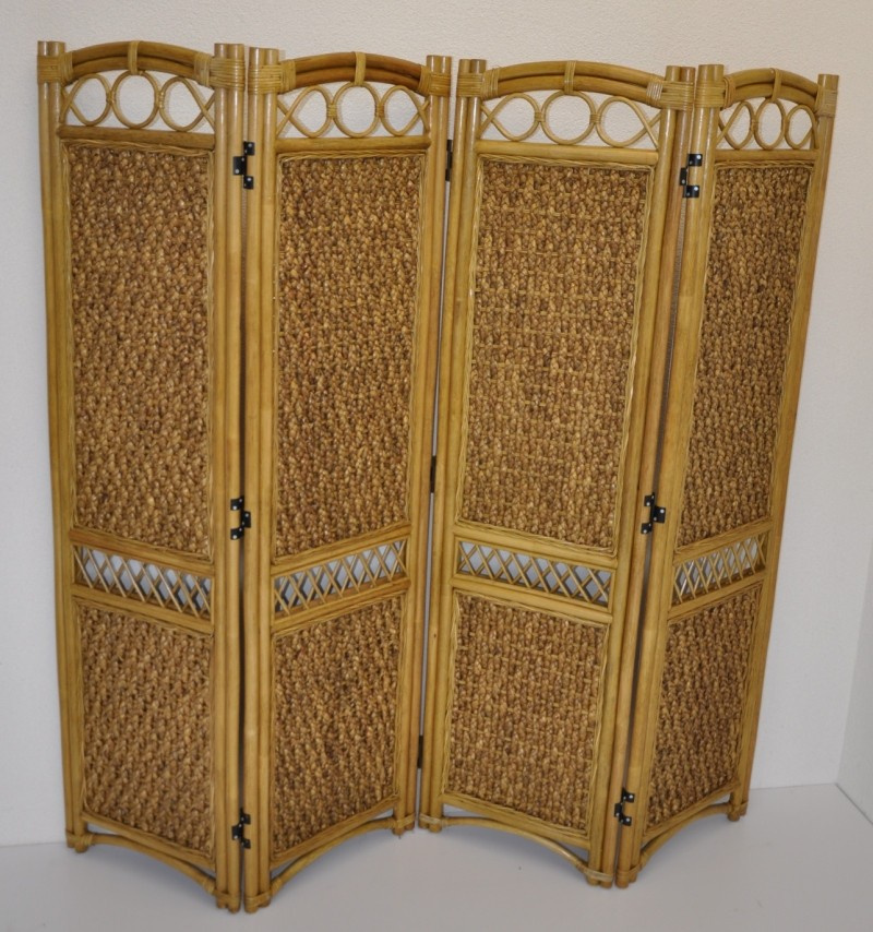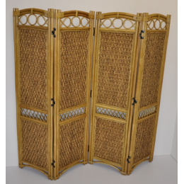 Čtyřdílný paravan je nejen vhodným bytovým doplňkem ale slouží zároveň k oddělení části vnitřních protor. | Výška paravanu je 171 cm. Paravan se skládá ze čtyřech dílů šíře 45 cm. Materiál konstrukce je přírodní ratan doplněný výpletem ze stonků vodního hyacintu. Barva ratanové konstrukce i výpletu je medová.