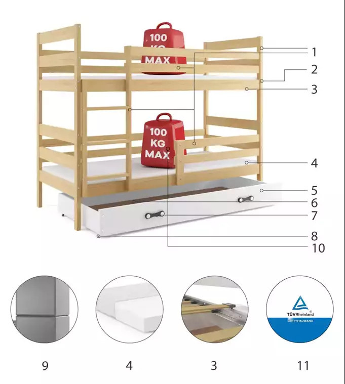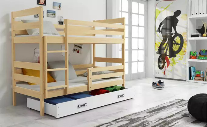 Dětská patrová postel ERYK se šuplíkem 90x200 cm, bez matrace, Přírodní/Bílá