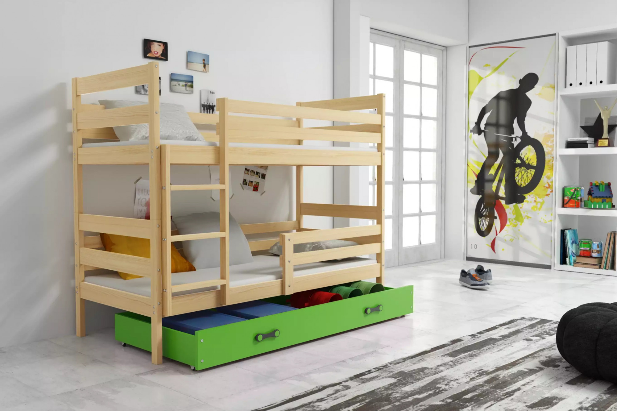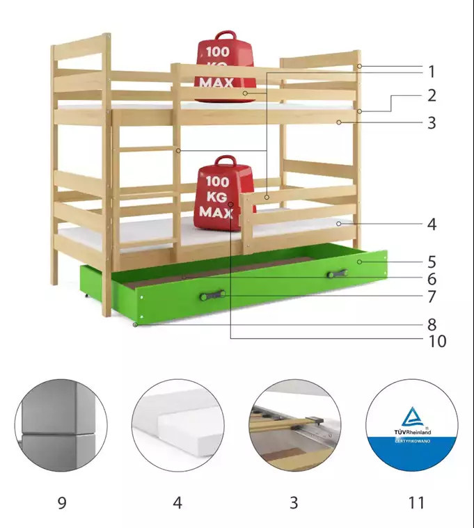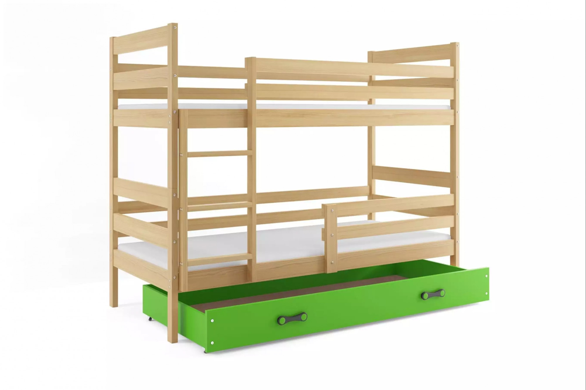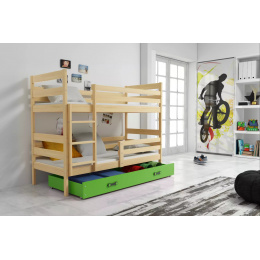 Dětská patrová postel ERYK se šuplíkem 90x200 cm, bez matrace, Přírodní/Zelená