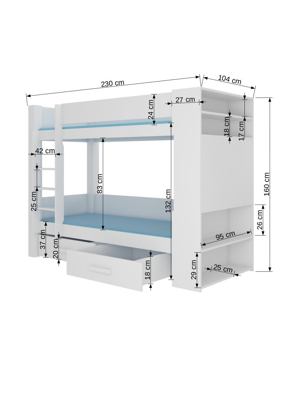 Patrová 2-lůžková postel GARET je skvělý nápad na úsporu místa v malém dětském pokoji. Nábytek obsahuje schůdkový žebřík a dvě prostorné a funkční zásuvky na ložní prádlo. Navíc na dvou úrovních byly namontovány zábradlí zvyšující bezpečnost během spánku. Model GARET má police umístěné jak z vnitřní, tak z vnější strany postele. Matrace nejsou součástí postele.