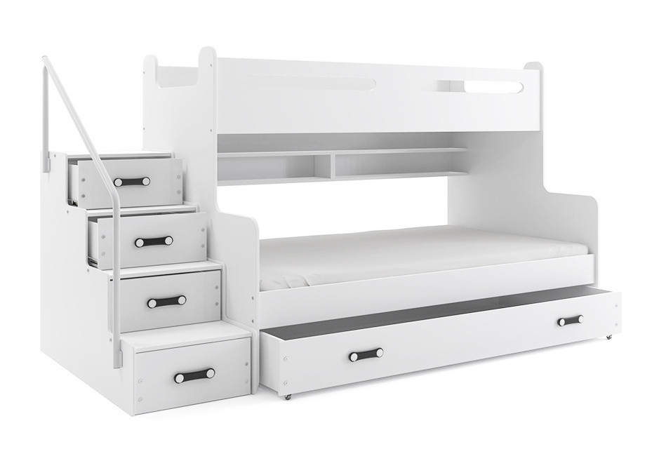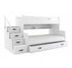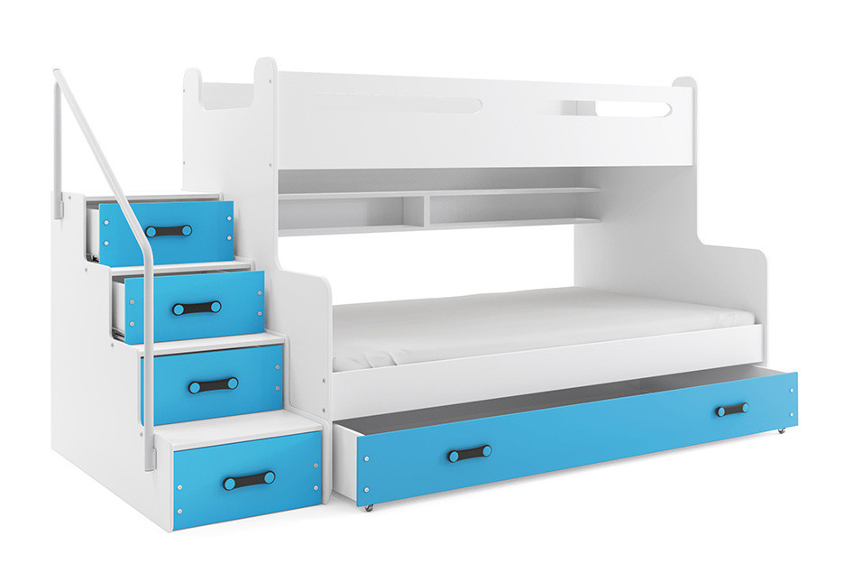 Dětská patrová postel Maty je určena pro ty, kteří pro své děti hledají funkčnost, moderní design a kvalitu. Její stabilní konstrukce, zaoblené hrany a zábrana na horní posteli, zajišťují bezpečnost a pohodlí dítěte. Postel nabízí prostor pro spaní až pro 3 děti a také spoustu úložných prostorů, které jsou v dětském pokoji nepostradatelné. Úložný prostor se skrývá ve spodní výsuvné části a také ve schůdkách, které vedou na vrchní část postele. Díky tomuto netradičnímu řešení, jsou schůdky dostatečně velké a bezpečné. Pro větší bezpečí Vašich dětí je na schůdkách umístěno zábradlí a vrchní postel má zvýšenou bočnici, která slouží jako zábrana. Součástí postele jsou 2 rošty a 2 pěnové matrace, plocha pro spaní je 1x 80x200 cm a 1x 120x200 cm. Tloušťka matrace je 9 cm. Postel nabízíme v několika barevných provedeních. Doporučená nosnost horního lůžka 70 kg, spodního lůžka 70 kg. Postel je dodávaná v demontu. Součástí balení je montážní návod včetně všech spojovacích prvků. Vyobrazené doplňky a dekorace nejsou v ceně. Zobrazení barev na fotografii se může od skutečnosti nepatrně lišit.