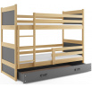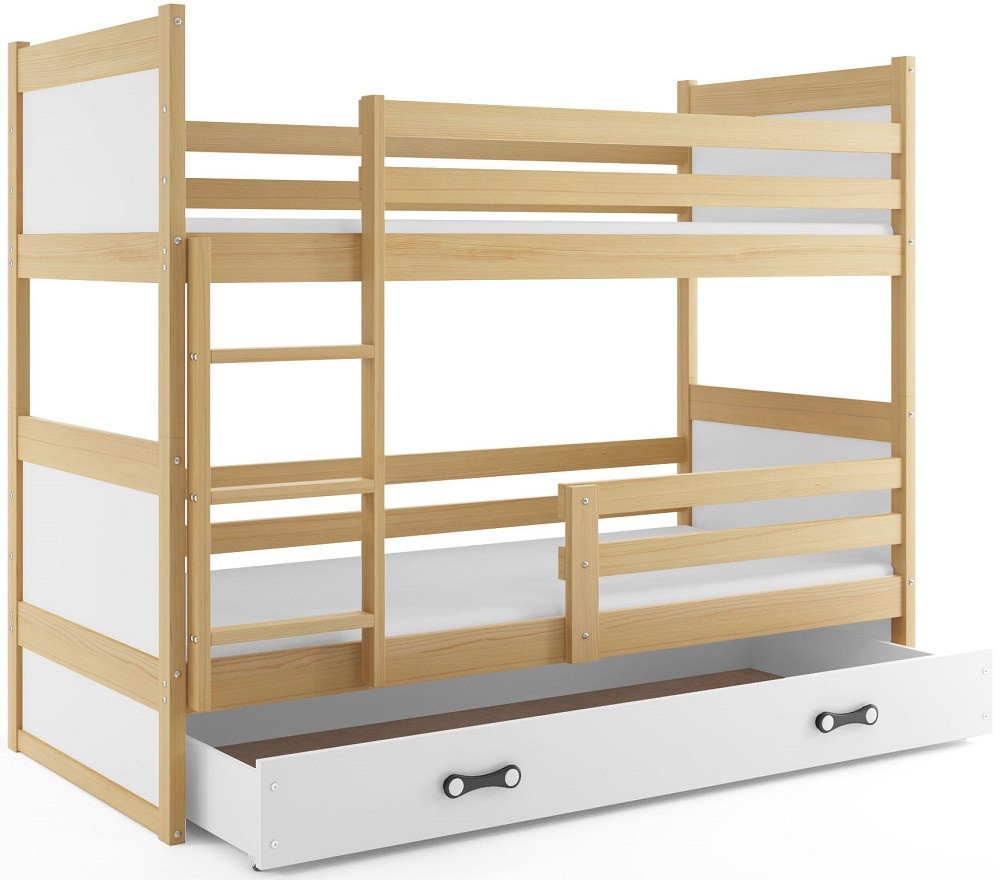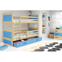 Dětská patrová postel Riky je určena pro ty, kteří pro své dítě hledají funkčnost, moderní design a kvalitu. Postel je vyrobena z borovicového dřeva v kombinaci s MDF deskou (barevné panely na bocích postele). Její stabilní konstrukce, zaoblené hrany a zábrana na horní i dolní posteli, zajišťují bezpečnost a pohodlí dítěte. Žebřík si můžete podle potřeby umístit na pravou, nebo levou stranu postele. Když děti patrová postel omrzí, je možno palandu rozložit na dvě samostatné postele. Součástí postele je 2x zábrana, praktický úložný prostor na kolečkách, 2x rošt a 2x pěnová matrace s doporučenou nosností do 70 kg. Tloušťka matrace je 7cm. Plocha pro spaní je 2x 90x200 cm. Postel je dodávána v demontu a součástí je montážní plánek včetně všech potřebných spojovacích materiálů. Vyobrazené dekorace nejsou v ceně. Zobrazení barev na fotografii se může od skutečnosti nepatrně lišit.